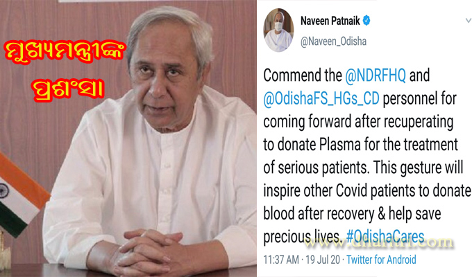 ଭୁବନେଶ୍ୱର,୧୯ା୭(ବ୍ୟୁରୋ): ଅଗ୍ନିଶମ କର୍ମଚାରୀ ଗୁରୁତର ଅସୁସ୍ଥ କରୋନା ରୋଗୀଙ୍କୁ ପ୍ଲାଜମା ଦାନ କରିବେ। ପ୍ରଥମ ପର୍ଯ୍ୟାୟରେ ୧୦ ଜଣ କର୍ମଚାରୀ ପ୍ଲାଜମା ଦାନ କରିବେ। କଟକ ଏସ୍ସିବି ମେଡିକାଲରେ ସେମାନଙ୍କଠାରୁ ପ୍ଲାଜମା ସଂଗ୍ରହ କରାଯିବ ବୋଲି ଶନିବାର ଅଗ୍ନିଶମ ଡିଜି ସତ୍ୟଜିତ୍ ମହାନ୍ତି ଟୁଇଟ୍ କରି ସୂଚନା ଦେଇଥିଲେ। ତେବେ ରବିବାର ମୁଖ୍ୟମନ୍ତ୍ରୀ ନବୀନ ପଟ୍ଟନାୟକ ଟୁଇଟ୍ କରି ଏହାର ପ୍ରଶଂସା କରିଛନ୍ତି। ରୋଗୀଙ୍କ ଚିକିତ୍ସା ପାଇଁ ପ୍ଲାଜମା ଦାନ କରିବାକୁ ଅଗ୍ନିଶମ କର୍ମଚାରୀମାନେ ଆଗକୁ ଆଗେଇ ଆସିବା ବେଶ୍ ପ୍ରଶଂସନୀୟ। ଏହା ଅନ୍ୟମାନଙ୍କୁ ପ୍ରେରଣା ଯୋଗାଇବ। ଏପରି ପଦକ୍ଷେପ ମୂଲ୍ୟବାନ ଜୀବନ ବଞ୍ଚାଇବାରେ ସାହାଯ୍ୟ କରିବ ବୋଲି ମୁଖ୍ୟମନ୍ତ୍ରୀ ତାଙ୍କ ଟୁଇଟ୍ରେ କହିଛନ୍ତି।