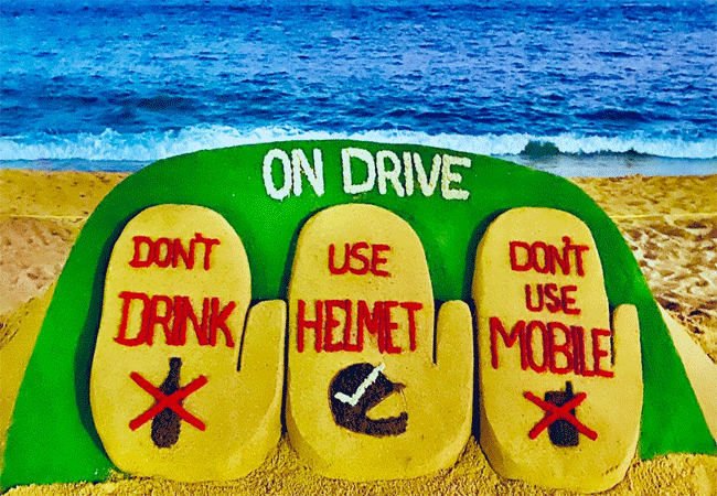 ପୁରୀ ଅଫିସ,୨୮।୨: ମାର୍ଚ୍ଚ ପହିଲାରୁ କଡ଼ାକଡ଼ି ହେବ ଟ୍ରାଫିକ୍ ନିୟମ। ଉଲ୍ଲଂଘନକାରୀଙ୍କଠାରୁ ମୋଟା ଅଙ୍କର ଜରିମାନା ଆଦାୟ କରାଯିବ। ଏହା ପୂର୍ବରୁ ବାଲୁକାକଳା ମାଧ୍ୟମରେ ଲୋକମାନଙ୍କୁ ସଚେତନ କରାଇଛନ୍ତି ବାଲୁକାଶିଳ୍ପୀ ସୁଦର୍ଶନ ପଟ୍ଟନାୟକ। ମଦ୍ୟପାନ କରି ଗାଡ଼ି ଚଳାନ୍ତୁ ନାହିଁ। ହେଲମେଟ୍ ବ୍ୟବହାର କରନ୍ତୁ। ଏଥିସହ ଗାଡ଼ି ଚଳାଇବା ବେଳେ ମୋବାଇଲ୍ ବ୍ୟବହାର କରନ୍ତୁ ବୋଲି ସୁଦର୍ଶନ ବାର୍ତ୍ତା ଦେଇ କହିଛନ୍ତି।