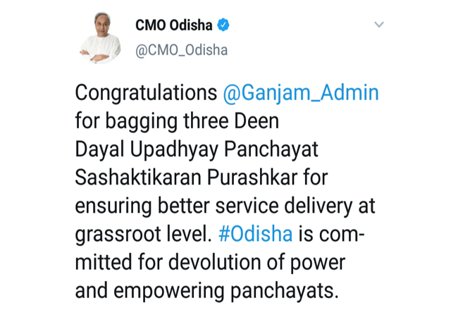 ଗଞ୍ଜାମର ହିଞ୍ଜିଳି ବ୍ଲକ, ୨ ପଞ୍ଚାୟତକୁ ମିଳିଛି ଜାତୀୟ ପୁରସ୍କାର: ଅଭିନନ୍ଦନ ଜଣାଇଲେ ମୁଖ୍ୟମନ୍ତ୍ରୀ