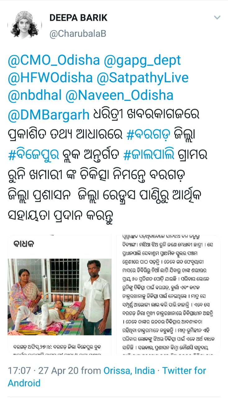 ବରଗଡ଼ ଜିଲା ବିଜେପୁର ବ୍ଲକ ଅନ୍ତର୍ଗତ ଜାଲପାଲି ଗ୍ରାମର ସୁଶୀଲ ଖମାରୀଙ୍କ ଶିଶୁକନ୍ୟା ରୁନି(୧୦) ପୋଡ଼ିଯାଇ ଗୁରୁତର ଅସୁସ୍ଥ ଅଛନ୍ତି। ଏ ନେଇ ସୋମବାର ଧରିତ୍ରୀରେ ଝିଅର ଚିକିତ୍ସାରେ ଅର୍ଥ ବାଧକ ଶୀର୍ଷକ ଏକ ଖବର ପ୍ରକାଶ ପାଇଥିଲା। ଏହି ଖବରକୁ ଆଧାର କରି ରୁନିଙ୍କୁ ଚିକିତ୍ସା ସହାୟତା ଯୋଗାଇ ଦେବାକୁ ବରଗଡ଼ ଜିଲା ପାଇକମାଳ ବ୍ଲକ ଟେମରୀ ଗ୍ରାମର ସାମାଜିକ କର୍ମୀ ଦୀପା ବାରିକ ମୁଖ୍ୟମନ୍ତ୍ରୀ, ସ୍ବାସ୍ଥ୍ୟ ଓ ପରିବାର ବିଭାଗ ଏବଂ ବରଗଡ଼ ଜିଲାପାଳଙ୍କୁ ଟୁଇଟ୍ କରି ଅନୁରୋଧ କରିଛନ୍ତି। ଖବର ଲେଖାହେବା ସୁଦ୍ଧା (ରାତ୍ରି ସାଢ଼େ ୭ଟା)ରେ ପ୍ରଶାସନିକ ଅଧିକାରୀମାନେ ବରଗଡ଼ ଜିଲା ମୁଖ୍ୟ ଚିକିତ୍ସାଳୟକୁ ଯାଇ ସେଠାରେ ଚିକିତ୍ସାଧୀନ ରୁନି ଓ ତାଙ୍କ ପରିବାରବର୍ଗଙ୍କୁ ଭେଟି ସମସ୍ୟା ଉପରେ ପଚରାଉଚୁରା କରୁଥିବା ସୂଚନା ମିଳିଛି।