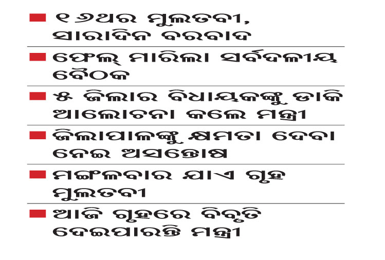 ଗୃହ ଅଚଳ ହେବା ପରେ ସୋମବାର ଅପରାହ୍ନରେ ଧାନ ସଂଗ୍ରହ ହେଉଥିବା ୫ଟି ଜିଲା କଳାହାଣ୍ଡି, ବାଲେଶ୍ୱର, ନୂଆପଡ଼ା, ସୋନପୁର ଏବଂ ବଲାଙ୍ଗୀରର ବିଧାୟକମାନଙ୍କୁ ଡାକି ଖାଦ୍ୟ ଯୋଗାଣ ଓ ଖାଉଟି କଲ୍ୟାଣ ବିଭାଗ ମନ୍ତ୍ରୀ ରଣେନ୍ଦ୍ର ପ୍ରତାପ ସ୍ବାଇଁ ବିଧାନସଭାର ୫୪ ନମ୍ବର ପ୍ରକୋଷ୍ଠରେ ଆଲୋଚନା କରିଛନ୍ତି। ଯେଉଁ ଜିଲାରେ ଧାନ ବିକ୍ରି ସମସ୍ୟା ରହିଛି ସେଠାକାର ଜିଲାପାଳମାନଙ୍କୁ ତାଲିକା ଦେବାକୁ ନିର୍ଦ୍ଦେଶ ଦିଆଯାଇଛି। ତେବେ ଏହାକୁ ନେଇ ବିଧାୟକମାନେ ଅସନ୍ତୋଷ ବ୍ୟକ୍ତ କରିଛନ୍ତି। ସମସ୍ୟା ସମାଧାନ ହୋଇ ନ ଥିବାରୁ ମଙ୍ଗଳବାର ପୁଣି ବିଧାନସଭାରେ ବିରୋଧୀ ସରକାରଙ୍କୁ ଘେରିବା ନେଇ ସୂଚନା ମିଳିଛି।