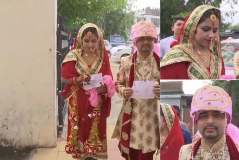 ଶ୍ରୀନଗର,୧୮।୪: ଲୋକ ସଭା ନିର୍ବାଚନରେ ଗୁରୁବାର ଦ୍ୱିତୀୟ ପର୍ଯ୍ୟାୟ ମତଦାନ ଜାରି ରହିଛି। ଭୋଟରଙ୍କ ମଧ୍ୟରେ ମତଦାନ ପାଇଁ ଉତ୍ସାହ ଦେଖିବାକୁ ମିଳୁଛି। ଏହି ମର୍ମରେ ଜମ୍ମୁ-କଶ୍ମୀର ଉଧାମପୁର ଲୋକ ସଭା ଆସନରେ ଏକ ନବ ବିବାହିତ ଯୋଡ଼ି ମତଦାନ ଅଧିକାର ସାବ୍ୟସ୍ତ କରିବାକୁ ପହଞ୍ଚିଛନ୍ତି। ଉଭୟ ବିବାହ ପୋଷାକରେ ମତଦାନ କେନ୍ଦ୍ରରେ ପହଞ୍ଚିଥିଲେ। ସେମାନଙ୍କୁ ଦେଖି ପୋଲିଂ ଅଧିକାରୀଙ୍କ ସମତେ ଉପସ୍ଥିତ ଲୋକେ ଆଶ୍ଚର୍ଯ୍ୟ ହୋଇଯାଇଥିଲେ।