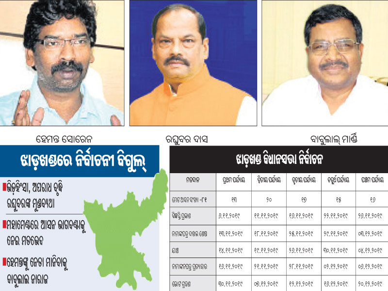 ନଭେମ୍ବର ୧୫ରେ ବିହାରରୁ ଅଲଗା ହୋଇ ଝାଡ଼ଖଣ୍ଡ ରାଜ୍ୟ ଗଠନ ହେବା ପରଠୁ ଏହା ହେଉଛି ଚତୁର୍ଥ ବିଧାନସଭା ନିର୍ବାଚନ। ଏହି ନିର୍ବାଚନରେ ଭାଜପା ଏକାକୀ ୬୫ ଆସନ ଦଖଲ କରି ସରକାର ଗଢ଼ିବ ବୋଲି ରଘୁବର ଦୃଢ଼ୋକ୍ତି ବାଢ଼ିଛନ୍ତି। ଅନ୍ୟପକ୍ଷରେ ବିରୋଧୀ କଂଗ୍ରେସ ଏବଂ ଜେଏମ୍‌ଏମ୍‌ ମେଣ୍ଟ ରଘୁବର ଦାସ ସରକାରଙ୍କୁ କ୍ଷମତାରୁ ହଟାଇବା ପାଇଁ ଅଣ୍ଟାଭିଡ଼ିଛନ୍ତି। ରାଜ୍ୟ ଗଠନ ହେବା ପରଠୁ ରଘୁବର ହେଉଛନ୍ତି ଏକମାତ୍ର ମୁଖ୍ୟମନ୍ତ୍ରୀ ଯିଏ ସମ୍ପୂର୍ଣ୍ଣ ୫ ବର୍ଷ ସରକାର ଚଳାଇବାରେ ସକ୍ଷମ ହୋଇଛନ୍ତି। ନିର୍ବାଚନ ତାରିଖ ଘୋଷଣା ପୂର୍ବରୁ ଉଭୟ ଶାସକ ଓ ବିରୋଧୀ ପ୍ରଚାର ଚଳାଇଛନ୍ତି। ମୁଖ୍ୟମନ୍ତ୍ରୀ ନିକଟରେ ଜୋହର ଜନାଶୀର୍ବାଦ ଯାତ୍ରା ଶେଷ କରିଛନ୍ତି। ସେହିପରି ମତଦାତାଙ୍କୁ ନିଜ ସପକ୍ଷକୁ ଟାଣିବା ପାଇଁ ଜେଏମ୍‌ଏମ୍‌ ନେତା ହେମନ୍ତ ସୋରେନ୍‌ ପରିବର୍ତ୍ତନ ଯାତ୍ରା କରିଥିବାବେଳେ ଜେଭିଏମ୍‌-ପି ମୁଖ୍ୟ ବାବୁଲାଲ ମାର୍ଣ୍ଡି ଜନାଦେଶ ଯାତ୍ରାର ଆୟୋଜନ କରିଛନ୍ତି। ମିଳିଥିବା ସୂଚନାନୁସାରେ ଜେଏମ୍‌ଏମ୍‌ ୪୩ରୁ ୪୫, କଂଗ୍ରେସ ୨୫ରୁ ୨୭ ଆସନରେ ଲଢ଼ିପାରନ୍ତି। ସେହିପରି ମହାମେଣ୍ଟ ପକ୍ଷରୁ ରାଷ୍ଟ୍ରୀୟ ଜନତା ଦଳ (ଆର୍‌ଜେଡି) ଏବଂ ବାମଦଳକୁ ୫ଟି ଲେଖାଏ ଆସନରେ ପ୍ରତିଦ୍ୱନ୍ଦ୍ୱିତା ପାଇଁ ସୁଯୋଗ ଦିଆଯାଇପାରେ। ତେବେ ହେମନ୍ତଙ୍କୁ ମହାମେଣ୍ଟ ନେତା ଭାବେ ଗ୍ରହଣ କରିବାକୁ ବାବୁଲାଲ ପ୍ରସ୍ତୁତ ନ ଥିବା ଜଣାପଡ଼ିଛି। କାରଣ ଅନୂ୍ୟନ ୨୨ ଆସନରେ ଜେଭିଏମ୍‌-ପି ପକ୍ଷରୁ ପ୍ରାର୍ଥୀ ଦେବା ପାଇଁ ବାବୁଲାଲ ଚାହୁଁଛନ୍ତି। ୫ ମାସ ତଳେ ଅନୁଷ୍ଠିତ ଲୋକ ସଭା ନିର୍ବାଚନରେ ରାଜ୍ୟର ୧୪ ଆସନରୁ ଭାଜପା ନେତୃତ୍ୱାଧୀନ ଜାତୀୟ ଗଣତାନ୍ତ୍ରିକ ମେଣ୍ଟ (ଏନ୍‌ଡିଏ) ୧୨ଟି ଆସନ ଦଖଲ କରିଥିଲା। ଏଭଳି ସମୟରେ ୧୯୯୫ରୁ ୫ ଥର ବିଧାୟକ ହୋଇ ପ୍ରଥମ ଅଣଆଦିବାସୀ ନେତା ଭାବେ ମୁଖ୍ୟମନ୍ତ୍ରୀ ଆସନ ଅଳଙ୍କୃତ କରିଥିବା ରଘୁବର ଦାସଙ୍କୁ ଗାଦିଚ୍ୟୁତ କରିବା ବିରୋଧୀଙ୍କ ପାଇଁ ଏକ ବିରାଟ ଚ୍ୟାଲେଞ୍ଜ ହୋଇଛି। ତେବେ ରାଜ୍ୟରେ ଅପରାଧ ବିଶେଷକରି ଭିଡ଼ହିଂସା ବୃଦ୍ଧିପାଇବା ରଘୁବରଙ୍କ ପାଇଁ ଚିନ୍ତାର କାରଣ ସାଜିଥିବାବେଳେ ବିଗତ ୫ ବର୍ଷ ଧରି ଶାସକ ଭାଜପାରେ ବଢ଼ୁଥିବା ଅସନ୍ତୋଷ ତାଙ୍କୁ ଅଡ଼ୁଆରେ ପକାଇପାରେ। ପ୍ରକାଶ ଯେ, ୨୦୦୦ରେ ଝାଡ଼ଖଣ୍ଡ ଗଠନ ହେବାଠାରୁ ଭାଜପା ଅଧିକାଂଶ ସମୟ କ୍ଷମତାରେ ରହିଛି। କଂଗ୍ରେସ ନେତୃତ୍ୱାଧୀନ ସଂଯୁକ୍ତ ପ୍ରଗତିଶୀଳ ମେଣ୍ଟ (ଉପା) ୨୦୦୯ ଓ ୨୦୦୪ରେ ସରକାର ଗଢ଼ିଥିଲା। ୨୦୧୪ରେ ଭାଜପା କ୍ଷମତାକୁ ଫେରିବା ପରେ ରଘୁବର ଶାସନ ଡୋରି ଧରିଥିଲେ।