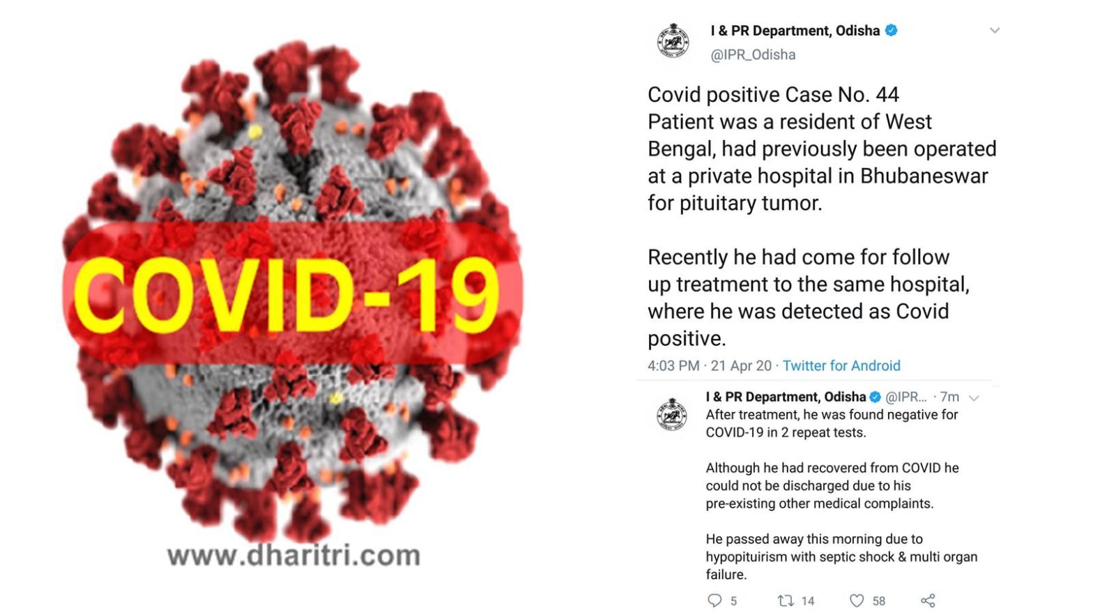 ଭୁବନେଶ୍ୱର, ୨୧।୪(ବ୍ୟୁରୋ): ଓଡ଼ିଶାରେ ୪୪ ନମ୍ବର କରୋନା ଆକ୍ରାନ୍ତ ସୁସ୍ଥ ହେବାପରେ ମଙ୍ଗଳବାର ତାଙ୍କର ମୃତ୍ୟୁ ଘଟିଛି। କିଛି ଦିନ ତଳେ ପଶ୍ଚିମବଙ୍ଗ ମେଦିନିପୁରରୁ ଚିକିତ୍ସା ଲାଗି ଭୁବନେଶ୍ୱରର ଏକ ଘରୋଇ ହସ୍ପିଟାଲକୁ ଆସିଥିଲେ। ସେଠାରେ ଅନ୍ୟ ରୋଗର ଚିକିତ୍ସା ଚାଲିଥିବା ବେଳେ ସେ କରୋନାରେ ଆକ୍ରାନ୍ତ ହୋଇଥିବା ଜଣାପଡ଼ିଥିଲା। ପରେ କୋଭିଡ ହସ୍ପିଟାଲରେ ତାଙ୍କର କରୋନା ଚିକିତ୍ସା ହୋଇଥିଲା। ଲଗାତାର ଦୁଇଥର ତାଙ୍କ ସ୍ବାବ୍ ନମୂନା ପରୀକ୍ଷଣ ପରେ ନେଗେଟିଭ୍ ଜଣାପଡ଼ିଥିଲା। କିନ୍ତୁ ତାଙ୍କର ଅନ୍ୟ ସ୍ବାସ୍ଥ୍ୟଗତ ସମସ୍ୟା ଥିବାରୁ ଡିସ୍ଚାର୍ଜ କରାଯାଇ ନ ଥିଲା। ତେବେ ମଙ୍ଗଳବାର ସକାଳୁ ତାଙ୍କର ମୃତ୍ୟୁ ଘଟିଥିବା ସ୍ବାସ୍ଥ୍ୟ ବିଭାଗ ପକ୍ଷରୁ ସୂଚନା ଦିଆଯାଇଛି।