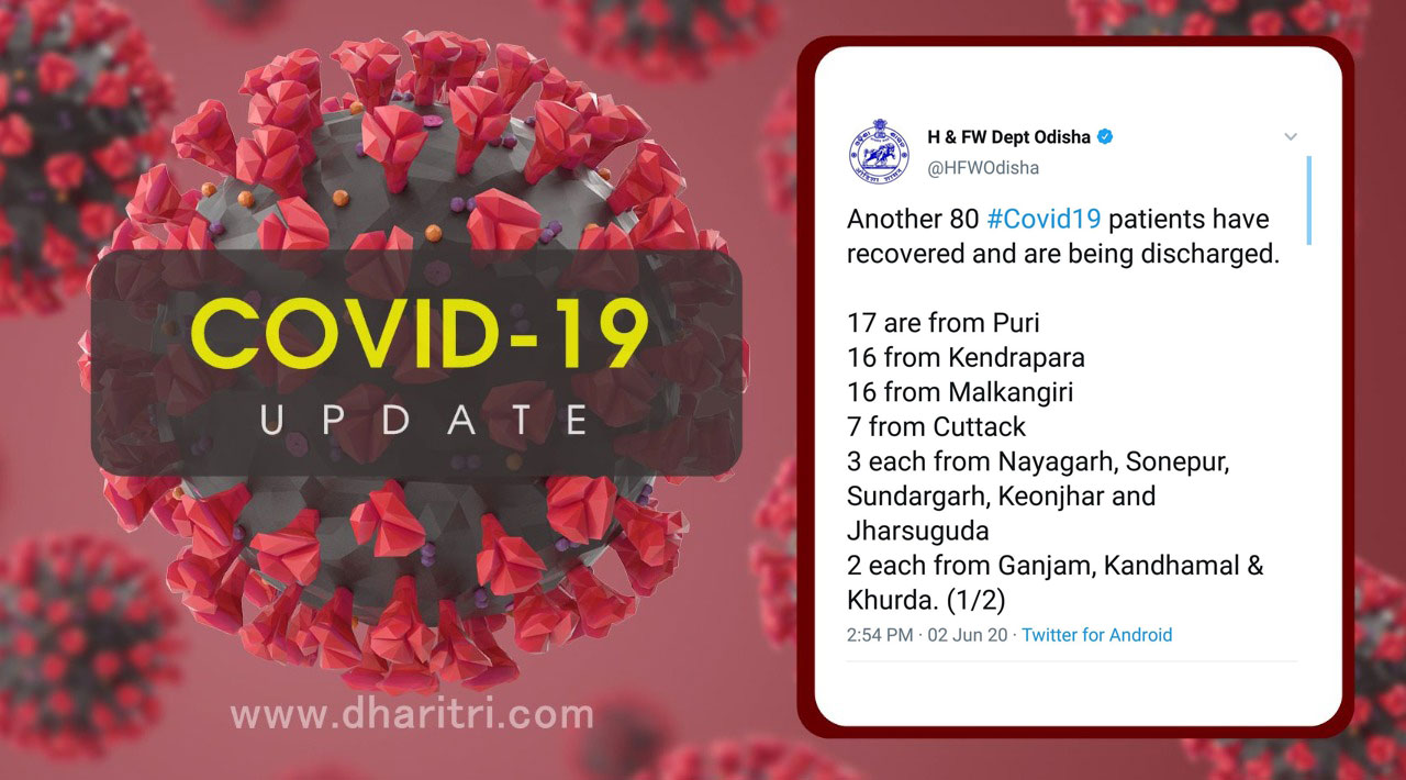 ରାଜ୍ୟରେ ସୁସ୍ଥ ହେଲେ ଆଉ ୮୦ କରୋନା ଆକ୍ରାନ୍ତ: ମୋଟ ଆରୋଗ୍ୟ ସଂଖ୍ୟା ୧୩୨୫ ଛୁଇଁଲା