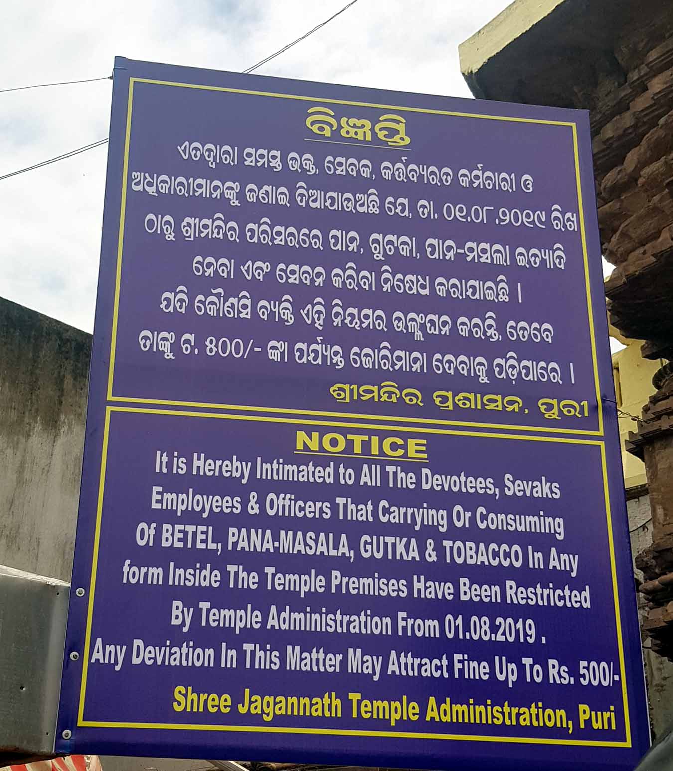 ପୁରୀ ଅଫିସ, ୧ା୮: ଏଣିକି ପାନ, ଗୁଟୁଖା ଖାଇ କେହି ଶ୍ରୀମନ୍ଦିରକୁ କେହି ପ୍ରବେଶ କରିପାରିବେ ନାହିଁ। ସେବାୟତ ହୁଅନ୍ତୁ ଅବା ଭକ୍ତ କିମ୍ବା କର୍ମଚାରୀ କାହାକୁ ବି ଛଡାଯିବ ନାହିଁ। କେହି ବି ଧରାପଡିଲେ ସେମାନଙ୍କଠାରୁ ଆଦାୟ ହେବ ଜରିମାନା। ଶ୍ରୀମନ୍ଦିରରେ ସ୍ବଚ୍ଛତା ରକ୍ଷା ଲାଗି ମନ୍ଦିର ପ୍ରଶାସନର ଏହି ନିଷ୍ପତ୍ତିକୁ ଗୁରୁବାରଠାରୁ କଡ଼ାକଡ଼ି ଭାବେ ଲାଗୁ କରାଯାଇଛି। ପ୍ରଥମ ଦିନରେ ୪ ଜଣ ପାନ ଖାଇ ମନ୍ଦିରକୁ ପ୍ରବେଶ କରିଥିବାରୁ ସେମାନଙ୍କଠାରୁ ଜରିମାନା ଆଦାୟ କରାଯାଇଛି। ପ୍ରତ୍ୟେକଙ୍କଠାରୁ ୧୦୦ ଟଙ୍କା ଲେଖାଏ ଜରିମାନା ଆଦାୟ କରାଯାଇଛି। ଅନ୍ୟପକ୍ଷରେ ଭକ୍ତଙ୍କ ଅବଗତି ନିମନ୍ତେ ଚାରିଦ୍ୱାର ଏବଂ ଶ୍ରୀମନ୍ଦିର ଭିତରେ ସୂଚନା ଫଳକ ଲଗାଯାଇଥିବାବେଳେ ସୂଚନା କେନ୍ଦ୍ରରୁ ଡାକବାଜି ଯନ୍ତ୍ର ଯୋଗେ ବିଭିନ୍ନ ଭାଷା(ଓଡ଼ିଆ, ହିନ୍ଦୀ, ବଙ୍ଗଳା)ରେ ସଚେତନ ମଧ୍ୟ କରାଯାଉଛି। ପ୍ରଶାସନର ଏଭଳି ନିଷ୍ପତ୍ତିକୁ ସବାୟତ, ଭକ୍ତ ସମସ୍ତେ ସ୍ବାଗତ କରିଛନ୍ତି।