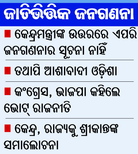 ଗତ ୫ ତାରିଖ ଏମ୍ପି ଭି.ବିଜୟସାହି ରେଡ୍ଡୀଙ୍କ ଅଣତାରକା ପ୍ରଶ୍ନ ନଂ. ୩୭୮ର ଉତ୍ତର ଦେଇ ନିତ୍ୟାନନ୍ଦ ରାୟ ଉପରୋକ୍ତ ତଥ୍ୟ ପ୍ରଦାନ କରିଥିଲେ। ବିଜୟସାହି ପ୍ରଶ୍ନ କରିଥିଲେ ଯେ, ସରକାର ୨୦୨୧ ଜନଗଣନାରେ ଓବିସି/ଏସ୍ଇବିସିଙ୍କୁ ଅନ୍ତର୍ଭୁକ୍ତ କରାଯିବ ବୋଲି ମତ ପ୍ରକାଶ କରିଥିଲେ। ହେଲେ ରେଜିଷ୍ଟ୍ରାର ଅଫ୍ ଇଣ୍ଡିଆ ଓବିସି ସମ୍ପର୍କିତ ତଥ୍ୟ ନେବା ପାଇଁ ନିଷ୍ପତ୍ତି ନେଇ ନାହାନ୍ତି କାହିଁକି । ସେହିଭଳି ସରକାର ଜନଗଣନା-୨୦୨୧ରେ ଓବିସିଙ୍କ ତଥ୍ୟ ସଂଗ୍ରହ ନେଇ ରେଜିଷ୍ଟ୍ରାରଙ୍କୁ ନିର୍ଦ୍ଦେଶ ଦେବେ କି ବୋଲି ରେଡ୍ଡୀ ପ୍ରଶ୍ନ କରିଥିଲେ। ଏହାର ଉତ୍ତରରେ ନିତ୍ୟାନନ୍ଦ କହିଥିଲେ ଯେ, ଗତବର୍ଷ ମାର୍ଚ୍ଚ ୨୮ରେ ବିଜ୍ଞପ୍ତି ପ୍ରକାଶ ପାଇଥିବା ଗେଜେଟ୍ ଅନୁଯାୟୀ, ଜନଗଣନା-୨୦୨୧ରେ ଅନୁସୂଚିତ ଜାତି(ଏସ୍ସି) ଏବଂ ଅନୁସୂଚିତ ଜନଜାତି(ଏସ୍ଟି) ଜନଗଣନା କରାଯିବାର ବ୍ୟବସ୍ଥା ଥିବା କେନ୍ଦ୍ରମନ୍ତ୍ରୀ ଲିଖିତ ଉତ୍ତର ଦେଇଥିଲେ। ହେଲେ ମନ୍ତ୍ରୀଙ୍କ ଉତ୍ତରରେ ଓବିସି/ଏସ୍ଇବିସିଙ୍କ ଜନଗଣନା ନେଇ କୌଣସି ସୂଚନା ନାହିଁ। ତେଣୁ ଓଡ଼ିଶାର ଦାବି ସଂକଳ୍ପ ପ୍ରସ୍ତାବରେ ରହିଯିବ ବୋଲି ଧାରଣା ସୃଷ୍ଟି ହୋଇଛି। ଅପରପକ୍ଷରେ କେନ୍ଦ୍ର ଚାହିଁଲେ କ୍ୟାବିନେଟ୍ ସଂକଳ୍ପ କିମ୍ବା ପୂର୍ବ ନିୟମରେ ସଂଶୋଧନ କରିପାରିବେ ବୋଲି ସମୀକ୍ଷକମାନେ ମତ ରଖିଛନ୍ତି। ଆନୁଷ୍ଠାନିକ ଭାବେ ବିଜେଡି କିମ୍ବା ରାଜ୍ୟ ସରକାର ଏହା ଉପରେ କୌଣସି ମତ ରଖିନାହାନ୍ତି। ହେଲେ ବିରୋଧୀମାନେ ଜାତିଭିତ୍ତିକ ଜନଗଣନାକୁ ରାଜ୍ୟ ସରକାରଙ୍କ ପୌରନିର୍ବାଚନୀ ଚାଲ୍ ବୋଲି ଅଭିଯୋଗ କରିଛନ୍ତି। ଭାଜପା ନେତା ପୃଥ୍ବୀରାଜ ହରିଚନ୍ଦନ କହିଛନ୍ତି ଯେ, ଓବିସିଙ୍କ ପାଇଁ ଜନଗଣନା ଦାବି କରୁଥିବା ସରକାର ଦୀର୍ଘଦିନ ଧରି ଏହି ବର୍ଗକୁ ରାଜ୍ୟରେ ଅବହେଳା କରିଆସିିଛନ୍ତି। ସେହିଭଳି କଂଗ୍ରେସ ବିଧାୟକ ସୁରେଶ କୁମାର ରାଉତରାୟ ମଧ୍ୟ ରାଜ୍ୟ ସରକାରଙ୍କ ଦାବିକୁ ରାଜନୈତିକ ଉଦ୍ଦେଶ୍ୟ ପ୍ରଣୋଦିତ ବୋଲି ଅଭିହିତ କରିଛନ୍ତି। ଅପରପକ୍ଷରେ ପୂର୍ବତନ କେନ୍ଦ୍ରମନ୍ତ୍ରୀ ଶ୍ରୀକାନ୍ତ ଜେନା କହିଛନ୍ତି ଯେ, କେନ୍ଦ୍ର ଓ ରାଜ୍ୟ ସରକାର ମୂଳତଃ ପଛୁଆବର୍ଗ ବିରୋଧୀ। ନ ହେଲେ ଦୀର୍ଘ ୨ ଦଶନ୍ଧି ରହିବା ପରେ ରାଜ୍ୟ ସରକାର ହଠାତ୍ ଏ ସଂକଳ୍ପ ଆଣିଲେ କାହିଁକି। କେନ୍ଦ୍ର ଚାହିଁଲେ ଏହାକୁ କରିପାରିବେ, ହେଲେ ଆନ୍ତରିକତା ନ ଥିବାରୁ ଜାତିଭିତ୍ତିକ ଜନଗଣନା ପୁନର୍ବାର ଶୀତଳ ଭଣ୍ଡାରକୁ ଗଲା ବୋଲି ଶ୍ରୀକାନ୍ତ କହିଛନ୍ତି।