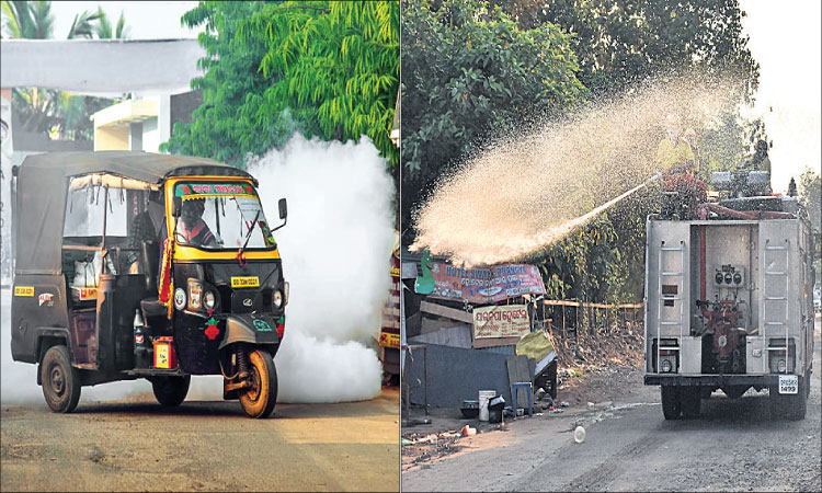 ଭୁବନେଶ୍ୱର, ୨।୪ (ବ୍ୟୁରୋ)/ କଟକରୋଡ, (ଡି.ଏନ.ଏ.): କରୋନା ଭୂତାଣୁ ସଂକ୍ରମଣରୁ ଭୁବନେଶ୍ୱରକୁ ରକ୍ଷା କରିବା ପାଇଁ ଆରମ୍ଭ ହୋଇଛି ବିଶୋଧନ କାର୍ଯ୍ୟକ୍ରମ। ବୁଧବାର ଦ୍ୱିତୀୟ ଦିନରେ ହାଇପୋକ୍ଲୋରାଇଡ୍ ମିଶା ପାଣିରେ ରାସ୍ତାଘାଟ ବଜାର, କଲୋନୀ ଆଦିକୁ ସାନିଟାଇଜ୍ କରାଯାଇଥିବାବେଳେ ଭୂତାଣୁନାଶକ ଧୂଆଁ ସ୍ପ୍ରେ ଆରମ୍ଭ ହୋଇଛି। ବିଏମ୍ସି ଓ ଅଗ୍ନିଶମ ବାହିନୀ ପକ୍ଷରୁ ଏହି କାର୍ଯ୍ୟ ଚାଲିଥିବାବେଳେ ଭୁବନେଶ୍ୱରର ୬୭ ଓ୍ବାର୍ଡ ମଧ୍ୟରୁ ୪୦ରୁ ଊର୍ଦ୍ଧ୍ୱ ଓ୍ବାର୍ଡକୁ ବିଶୋଧନ କରାଯାଇଛି। ଚଳିତ ସପ୍ତାହରେ ଏହି ପ୍ରକ୍ରିୟାରେ ସମସ୍ତ ଓ୍ବାର୍ଡ ସାମିଲ ହୋଇସାରିଥିବ ବୋଲି ବିଏମ୍ସି ପକ୍ଷରୁ କୁହାଯାଇଛି।
