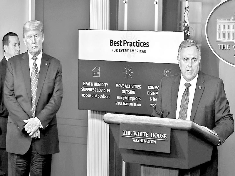 ମେରିଲାଣ୍ଡ୍ର ନ୍ୟାଶନାଲ ବାୟୋଡିଫେନ୍ସ ଆନାଲିସିସ୍ ଏବଂ କାଉଣ୍ଟମେଜର ସେଣ୍ଟରରେ କରାଯାଇଥିବା ପରୀକ୍ଷଣର ପ୍ରମୁଖ ଫଳାଫଳକୁ ବ୍ରାୟନ୍ ଏକ ସ୍ଲାଇଡ୍ ମାଧ୍ୟମରେ ଦେଖାଇଥିଲେ। ଏହା ଦର୍ଶାଇଥିଲା ଯେ, ୭୦-୭୫ ଡିଗ୍ରୀ ଫାରେନହିଟ୍(୨୧-୨୪ ଡିଗ୍ରୀ ସେଲସିୟସ୍ ତାପମାତ୍ରା)ରେ ଓ ଏହାସହ ୨୦ ପ୍ରତିଶତ ଆର୍ଦ୍ରତାରେ କରୋନା ଭାଇରସ୍ ୧୮ ଘଣ୍ଟାରେ ନଷ୍ଟ ହୋଇଯାଉଛି। କବାଟର ହ୍ୟାଣ୍ଡେଲ ଓ ଷ୍ଟେନ୍ଲେସ ଷ୍ଟିଲ୍ ଉପରେ ମଧ୍ୟ ଏହି ଭୂତାଣୁ ଏତିକି ସମୟ ପର୍ଯ୍ୟନ୍ତ ସକ୍ରିୟ ରୁହେ। ହେଲେ ଆର୍ଦ୍ରତା ୮୦ ପ୍ରତିଶତ ବଢ଼ିଗଲେ ମାତ୍ର ୬ ଘଣ୍ଟାରେ ଅଧା ଭାଇରସ୍ ନଷ୍ଟ ହୋଇଯାଇଥାଏ। ଯେତେବେଳେ ଏହା ସୂର୍ଯ୍ୟକିରଣରେ ରଖାଯାଉଛି ତେବେ ଏହା ନଷ୍ଟ ହେବାକୁ ମାତ୍ର ୨ ମିନିଟ ଲାଗୁଛି। ବ୍ରାୟନ୍ ଆଉ ଏକ ସିଦ୍ଧାନ୍ତରେ ପହଞ୍ଚିଛନ୍ତି ଯେ, ଗ୍ରୀଷ୍ମ ପରିବେଶରେ ସଂକ୍ରମଣ ହ୍ରାସ ହୋଇପାରିବ। ସେ ଆହୁରି ମଧ୍ୟ କହିଛନ୍ତି, ଭାଇରସ୍ ହ୍ରାସ ହେବାର ଅର୍ଥ ନୁହେଁ ଯେ ରୋଗ ସମ୍ପୂର୍ଣ୍ଣ ଭାବେ ବିଲୋପ ହୋଇଗଲା। ତେଣୁ ସାମାଜିକ ଦୂରତା ଭଳି ନିର୍ଦ୍ଦେଶାବଳୀ ସମ୍ପୂର୍ଣ୍ଣ ରୂପେ ଉଠାଯାଇପାରିବ ନାହିଁ। ଯଦି ଆମେ ଭାବିବା ଗ୍ରୀଷ୍ମରେ ଭାଇରସ୍ ସମ୍ପୂର୍ଣ୍ଣ ନଷ୍ଟ ହୋଇଯିବ ତେବେ ଏହା ଆମର ଦାୟିତ୍ୱହୀନତା ହେବ ବୋଲି ବ୍ରାୟନ୍ କହିଛନ୍ତି।