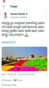ଭୁବନେଶ୍ୱର,୧୦।୩(ବ୍ୟୁରୋ): ଆଜି ପବିତ୍ର ହୋଲି। ସାରା ଦେଶରେ ଏହି ପର୍ବକୁ ଖୁବ୍ ଧୁମ୍ଧାମରେ ପାଳନ କରାଯାଉଥିବା ବେଳେ କେତେକ ସ୍ଥାନରେ କରୋନା ଭାଇରସ୍କୁ ନେଇ ହୋଲି ଫିକା ପଡ଼ିଛି। ତେବେ ଏହି ହୋଲି ଅବସରରେ ମୁଖ୍ୟମନ୍ତ୍ରୀ ନବୀନ ପଟ୍ଟନାୟକ ସମସ୍ତଙ୍କୁ ଶୁଭେଚ୍ଛା ଜଣାଇଛନ୍ତି। ସେ ଟୁଇଟ୍ କରି ଜଣାଇଛନ୍ତି, ମହାପ୍ରଭୁ ଜଗନ୍ନାଥଙ୍କ ଆଶୀର୍ବାଦରୁ ରଙ୍ଗର ପର୍ବ ହୋଲି ସମସ୍ତଙ୍କ ଲାଗି ଆନନ୍ଦମୟ ହେଉ। ସମସ୍ତେ ସୁରକ୍ଷିତ ଭାବରେ ଏହି ହୋଲି ଉତ୍ସବକୁ ପାଳନ କରନ୍ତୁ।