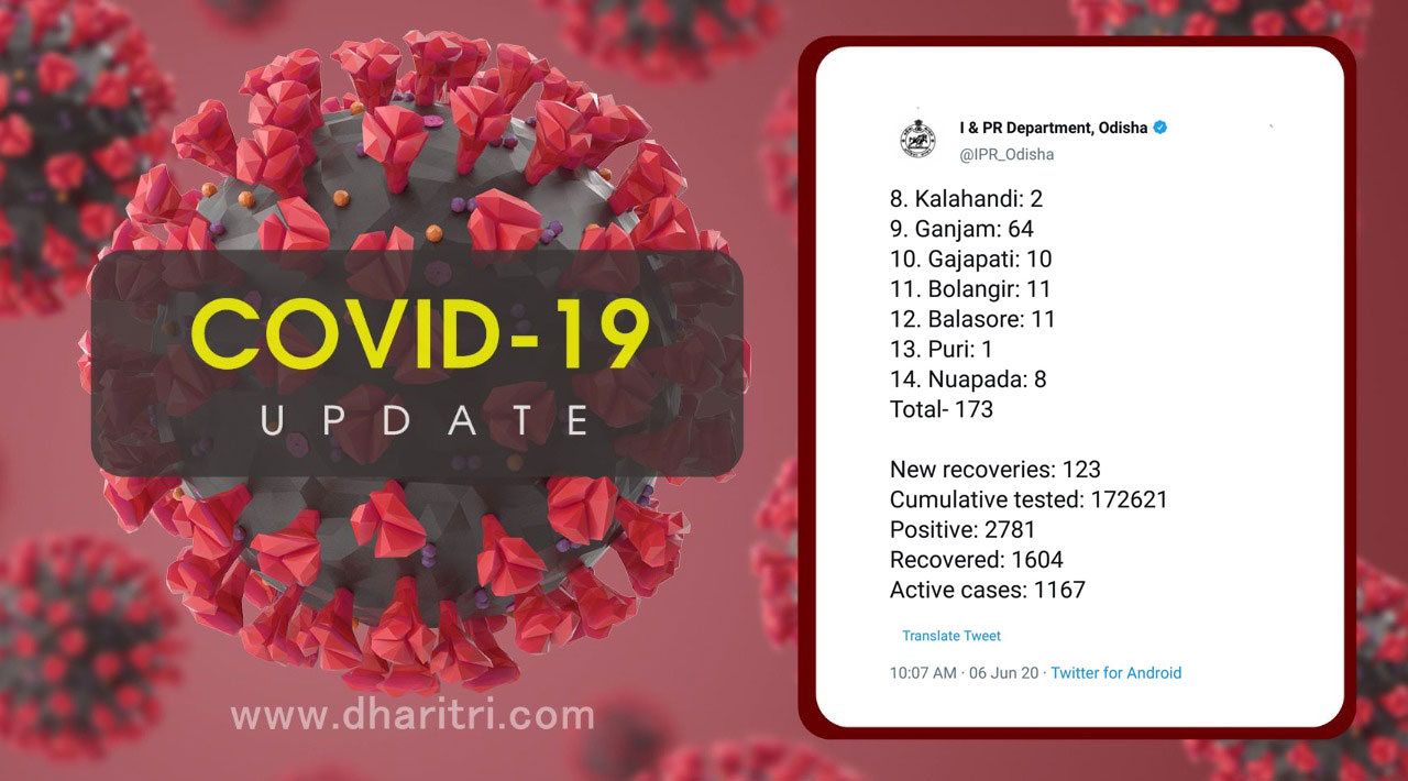 ଭୁବନେଶ୍ୱର,୬।୬(ବ୍ୟୁରୋ): ରାଜ୍ୟରୁ ଶନିବାର ଚିହ୍ନଟ ୧୭୩ କରୋନା ଆକ୍ରାନ୍ତ ୧୪ଟି ଜିଲାର। ଏମାନଙ୍କ ମଧ୍ୟରୁ ସର୍ବଧିକ ଗଞ୍ଜାମ ଜିଲାରୁ ୬୪ ଜଣ ରହିଛନ୍ତି। ସେହିପରି ଯାଜପୁରରୁ ୧୯, କଟକ ଓ ମୟୂରଭଞ୍ଜରୁ ୧୩, ବଲାଙ୍ଗୀର, ବାଲେଶ୍ୱରରୁ ୧୧, ଗଜପତି ୧୦, ନୂଆପଡ଼ା ୮, ନୟାଗଡ଼ ୭, ଭଦ୍ରକ ୪, କଳାହାଣ୍ଡି ୨, ପୁରୀ ଓ ଝାରସୁଗୁଡ଼ାରୁ ଜଣେ ଲେଖାଏ ଆକ୍ରାନ୍ତଙ୍କ ଚିହ୍ନଟ ହୋଇଛନ୍ତି। ତେବେ ଏମାନଙ୍କ ମଧ୍ୟରୁ ୧୫୦ଜଣ କ୍ୱାରାଣ୍ଟାଇନ୍ ସେଣ୍ଟରରୁ ଚିହ୍ନଟ ହୋଇଥିବା ବେଳେ ୨୩ଜଣ ଲୋକାଲ ବୋଲି ଜଣାପଡ଼ିଛି।