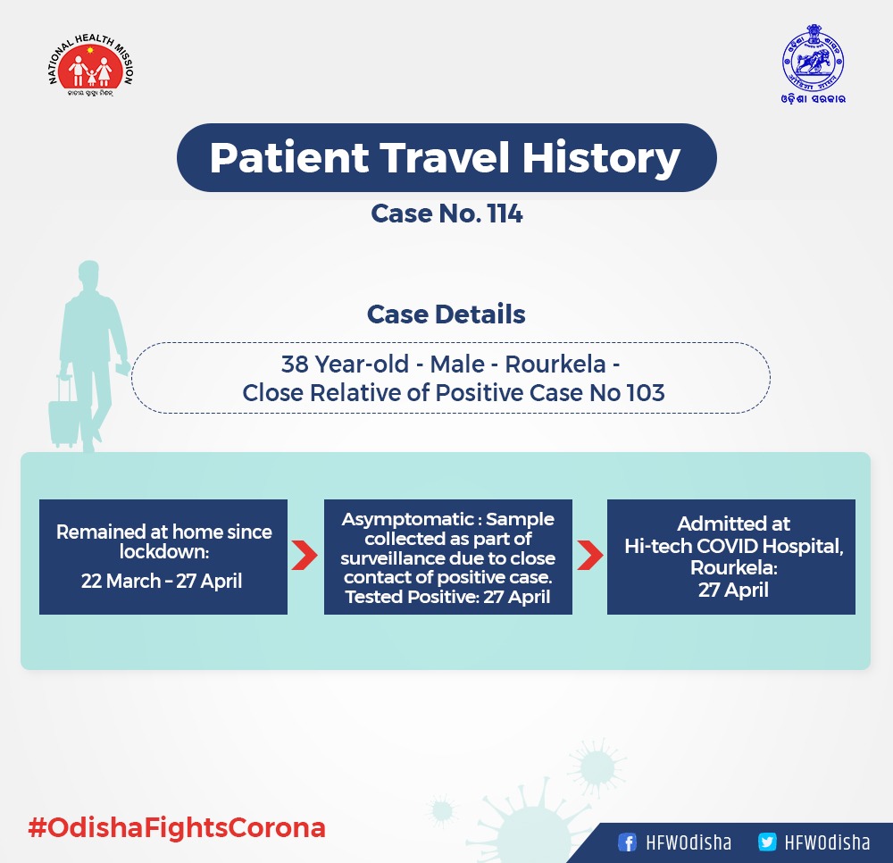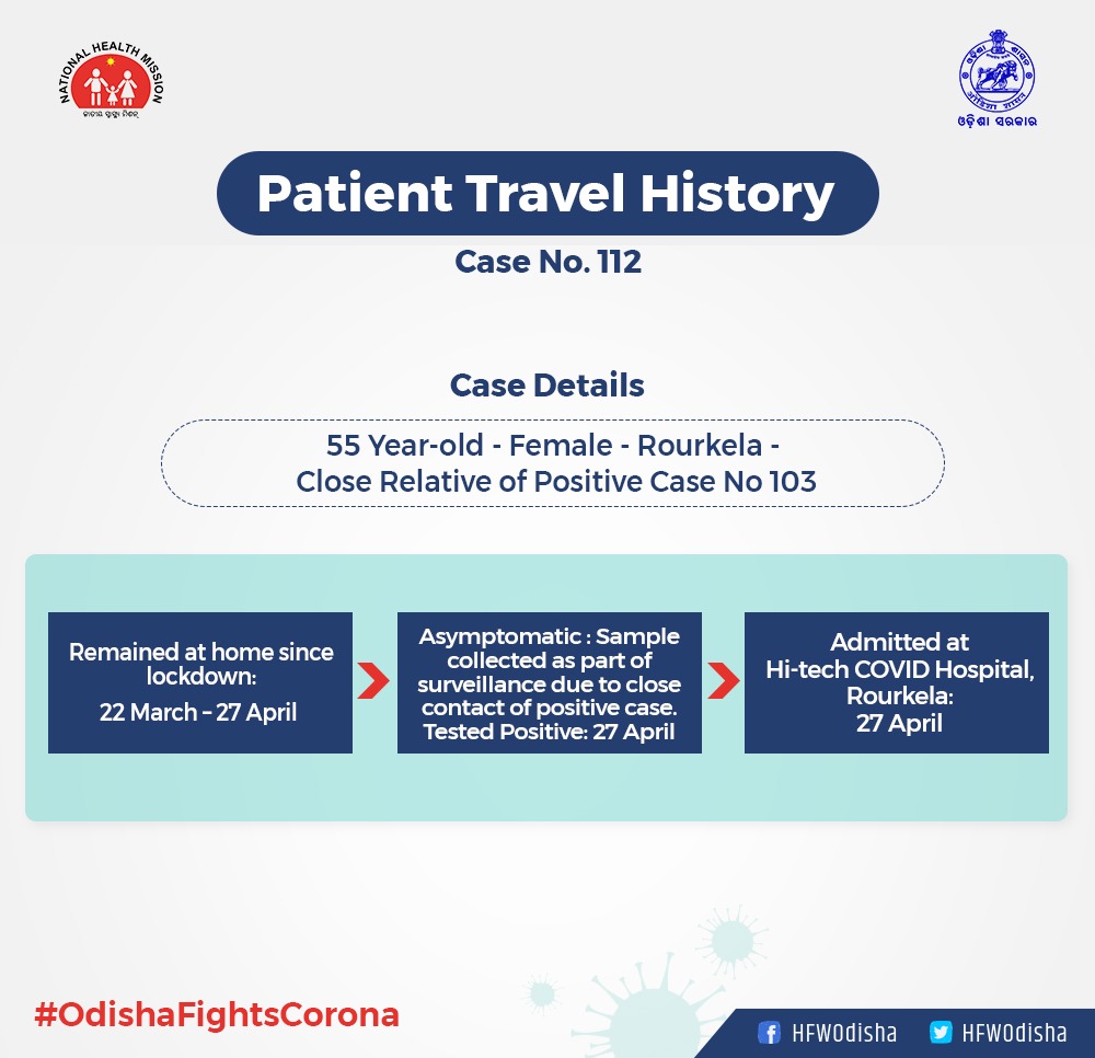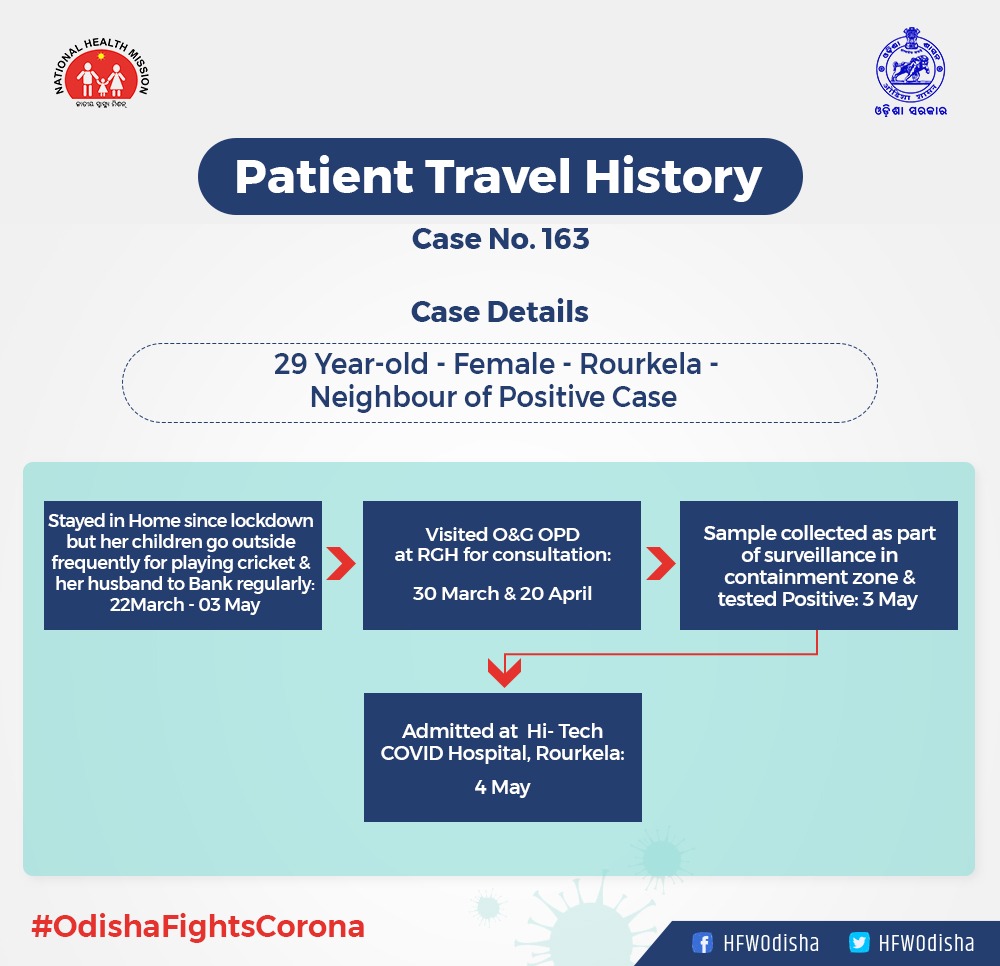 ଭୁବନେଶ୍ୱର,୫।୫(ବ୍ୟୁରୋ)-ରାଜ୍ୟ ସ୍ବାସ୍ଥ୍ୟ ଓ ପରିବାର କଲ୍ୟାଣ ବିଭାଗ ପକ୍ଷରୁ ମଙ୍ଗଳବାର ୧୦୩, ୧୧୨, ୧୧୩, ୧୧୪, ୧୧୫, ୧୬୩ ନଂ କରୋନା ଆକ୍ରାନ୍ତଙ୍କ ବିଷୟରେ ତଥ୍ୟ ପ୍ରଦାନ କରାଯାଇଛି। ୬ ଜଣଙ୍କ ଘର ସୁନ୍ଦରଗଡ଼ ଜିଲା ରାଉରକେଲାରେ ବୋଲି କୁହାଯାଇଛି। ୧୦୩ ନଂ କରୋନା ପଜିଟିଭ ଜଣେ ୬୦ ବର୍ଷିୟ ବୃଦ୍ଧ। ସେ ଲକ ଡାଉନ ସମୟରେ ଘରେ ରହୁଥିଲେ। ପରବର୍ତ୍ତୀ ସମୟରେ ତାଙ୍କର ଥଣ୍ଡା ଓ କାଶର ଲକ୍ଷଣ ଦେଖାଦେଇଥିଲା। ପରେ ୨୩ ଏପ୍ରିଲରେ ତାଙ୍କୁ କୋଭିଡ ହସ୍ପିଟାଲରେ ଆସୋଲେଶନରେ ରଖାଯାଇଥିଲା। ସେହିପରି ୧୧୨ ନଂ. ଆକ୍ରାନ୍ତଙ୍କ ବୟସ ୫୫ ବର୍ଷ ହୋଇଥିବାବେଳେ ସେ ୧୦୩ ନଂ କରୋନା ସଂକ୍ରମିତ ବ୍ୟକ୍ତି ସଂସ୍ପର୍ଶରେ ଆସିଥିଲେ। ତେବେ ତାଙ୍କ ନିକଟରେ କୌଣସି କରୋନା ଲକ୍ଷଣ ନ ଥିଲା। ୧୧୩ ନଂ. ଆକ୍ରାନ୍ତ ଜଣେ ୩୫ ବର୍ଷିୟ ମହିଳା ଓ ୧୧୪ ଆକ୍ରାନ୍ତ ଜଣେ ୩୮ ବର୍ଷିୟା ମହିଳା ହୋଇଥିବାବେଳେ ଉଭୟେ ୧୦୩ ନଂ ଆକ୍ରାନ୍ତଙ୍କ ସଂସ୍ପର୍ଶରେ ଆସିଥିବା ସ୍ବାସ୍ଥ୍ୟ ବିଭାଗ ପକ୍ଷରୁ ସୂଚନା ଦିଆଯାଇଛି। ୧୧୫ ନଂ ଆକ୍ରାନ୍ତ ବ୍ୟକ୍ତି ଜଣକ ୧୦୩ ନଂ. ଆକ୍ରାନ୍ତଙ୍କ ସଂସ୍ପର୍ଶରେ ଆସିଥିବା ବିଭାଗ ପକ୍ଷରୁ ସୂଚନା ମିଳିଛି। ୧୬୩ ନଂ. ସଂକ୍ରମିତ ବ୍ୟକ୍ତି ଜଣକ ତାଙ୍କ ପଡ଼ୋଶୀ କରୋନା ସଂକ୍ରମିତଙ୍କ ସଂସ୍ପର୍ଶରେ ଆସିଥିଲେ। ତେବେ ଲକ ଡାଉନ ସମୟରେ ତାଙ୍କ ପିଲାମାନେ ବାରମ୍ବାର କ୍ରିକେଟ ଖେଳୁଥିଲେ। ସେହିପରି ତାଙ୍କ ସ୍ବାମୀ ପ୍ରତିଦିନ ବ୍ୟାଙ୍କକୁ ଯିବା ଆସିବା କରୁଥିବା ବିଭାଗ ପକ୍ଷରୁ କୁହାଯାଇଛି।