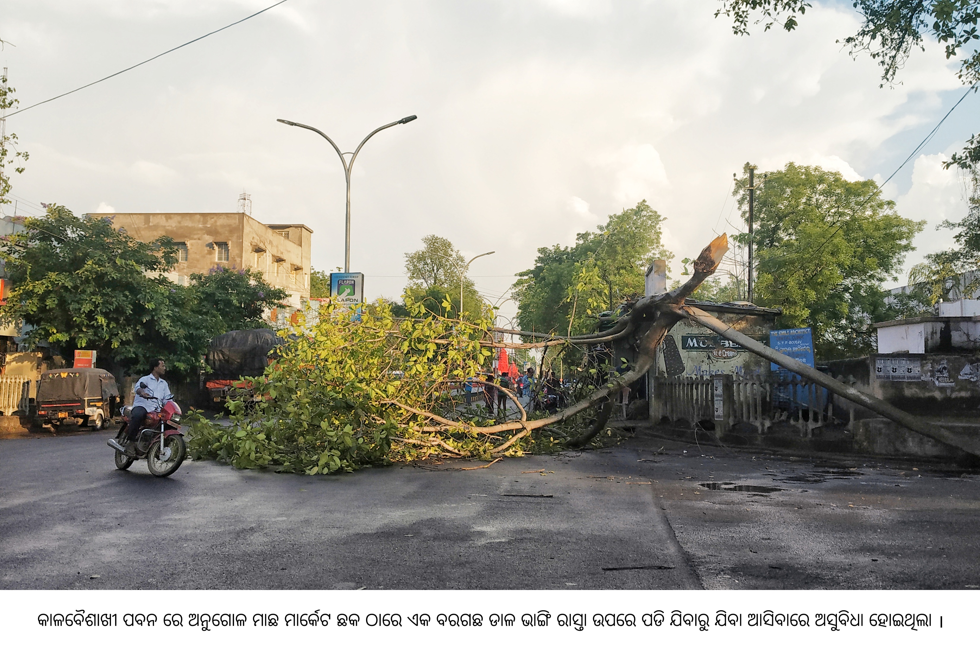 ଅନୁଗୋଳ ଅଫିସ, ୨୩।୪ଅନୁଗୋଳରେ ସୋମବାର ଅପରାହ୍ନରେ କାଳବୈଶାଖୀ ଯୋଗୁ ଲୋକଙ୍କୁ ବିଭିନ୍ନ ଅସୁବିଧାର ସମ୍ମୁଖୀନ ହେବାକୁ ପଡ଼ିଛି। ବହୁ ସ୍ଥାନରେ ଗଛ ଡାଳ ଭାଙ୍ଗି ରାସ୍ତା ଅବରୋଧ ହୋଇଥିବା ବେଳେ ଦୀର୍ଘ ସମୟ ଧରି ବିଦ୍ୟୁତ୍ ସେବା ବିଚ୍ଛିନ୍ନ ହୋଇଯାଇଥିଲା। ସକାଳେ ଚିକ୍ଚିକ୍ ଖରା ଥିଲେ ବି ଅପରାହ୍ନରେ ଆକାଶ ହଠାତ୍ ମେଘାଚ୍ଛନ୍ନ ହୋଇଯାଇଥିଲା। ଏହାପରେ ଜୋରଦାର ପବନ ସାଙ୍ଗକୁ ୧ ଘଣ୍ଟା ଧରି ବର୍ଷା ଚାଲିଥିଲା। ଫଳରେ ସହର ଓ ସହର ଉପକଣ୍ଠର ବିଭିନ୍ନ ସ୍ଥାନରେ ବହୁ ଗଛ ଭାଙ୍ଗି ରାସ୍ତାରେ ପଡ଼ିଥିଲା। ଏଥିଯୋଗୁ ଯାତାୟାତ କିଛି ସମୟ ପାଇଁ ବନ୍ଦ ହୋଇଯାଇଥିଲା। ସେହିପରି ବିଦ୍ୟୁତ୍ ସରବରାହ ମଧ୍ୟ ବନ୍ଦ ରହିଥିଲା। ତେବେ ବର୍ଷା ଛାଡ଼ିବା ପରେ ରାସ୍ତାରୁ ଗଛ ଡାଳ ସଫା କରାଯିବା ପରେ ଯାତାୟାତ ସ୍ବାଭାବିକ ହୋଇଥିଲା।