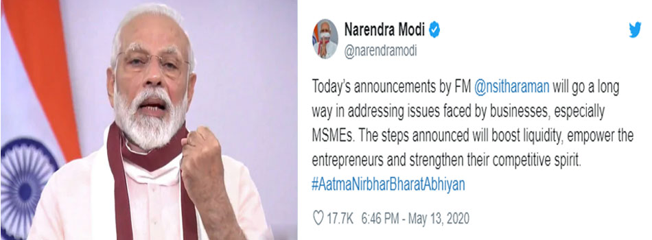 ନୂଆଦିଲ୍ଲୀ,୧୩।୫: କେନ୍ଦ୍ର ଅର୍ଥମନ୍ତ୍ରୀ ନିର୍ମଳା ସୀତାରମଣ ବୁଧବାର ଏକ ଖବରଦାତା ସମ୍ମିଳନୀରେ ୨୦ଲକ୍ଷ କୋଟି ଟଙ୍କାର ଆର୍ଥିକ ପ୍ୟାକେଜ ଘୋଷଣା କରିଛନ୍ତି। ଏହି ଘୋଷଣା ପରେ ପ୍ରଧାନମନ୍ତ୍ରୀ ନରେନ୍ଦ୍ର ମୋଦି ଏକ ଟୁଇଟ କରିଛନ୍ତି। ଟୁଇଟରେ ମୋଦି ଉଲ୍ଲେଖ କରିଛନ୍ତି ଯେ, ଅର୍ଥମନ୍ତ୍ରୀ ଘୋଷଣା କରିଥିବା ପ୍ୟାକେଜ ଦ୍ୱାରା ଉଦ୍ୟୋଗୀମାନେ ସଶକ୍ତ ହେବା ସହ ସେମାନଙ୍କର ପ୍ରତିଯୋଗୀତାମୂଳକ ଭାବନା ମଜଭୁତ ହେବ। ବିଶେଷକରି ଏହାଦ୍ୱାରା ଏମ୍ଏସ୍ଏମ୍ଇ ସମ୍ମୁଖୀନ ହେଉଥିବା ବହୁ ସମସ୍ୟାର ସମାଧାନ ହୋଇପାରିବ। ଏଥିସହ କେନ୍ଦ୍ର ସରକାର ଦ୍ୱାରା ନିଆଯାଇଥିବା ପଦକ୍ଷେପଗୁଡ଼ିକ ପାଇଁ ଲିକ୍ୱିଡିଟି ବା ନଗଦ ଅର୍ଥ ବୃଦ୍ଧି ପାଇବ ବୋଲି ମୋଦି କହିଛନ୍ତି।
