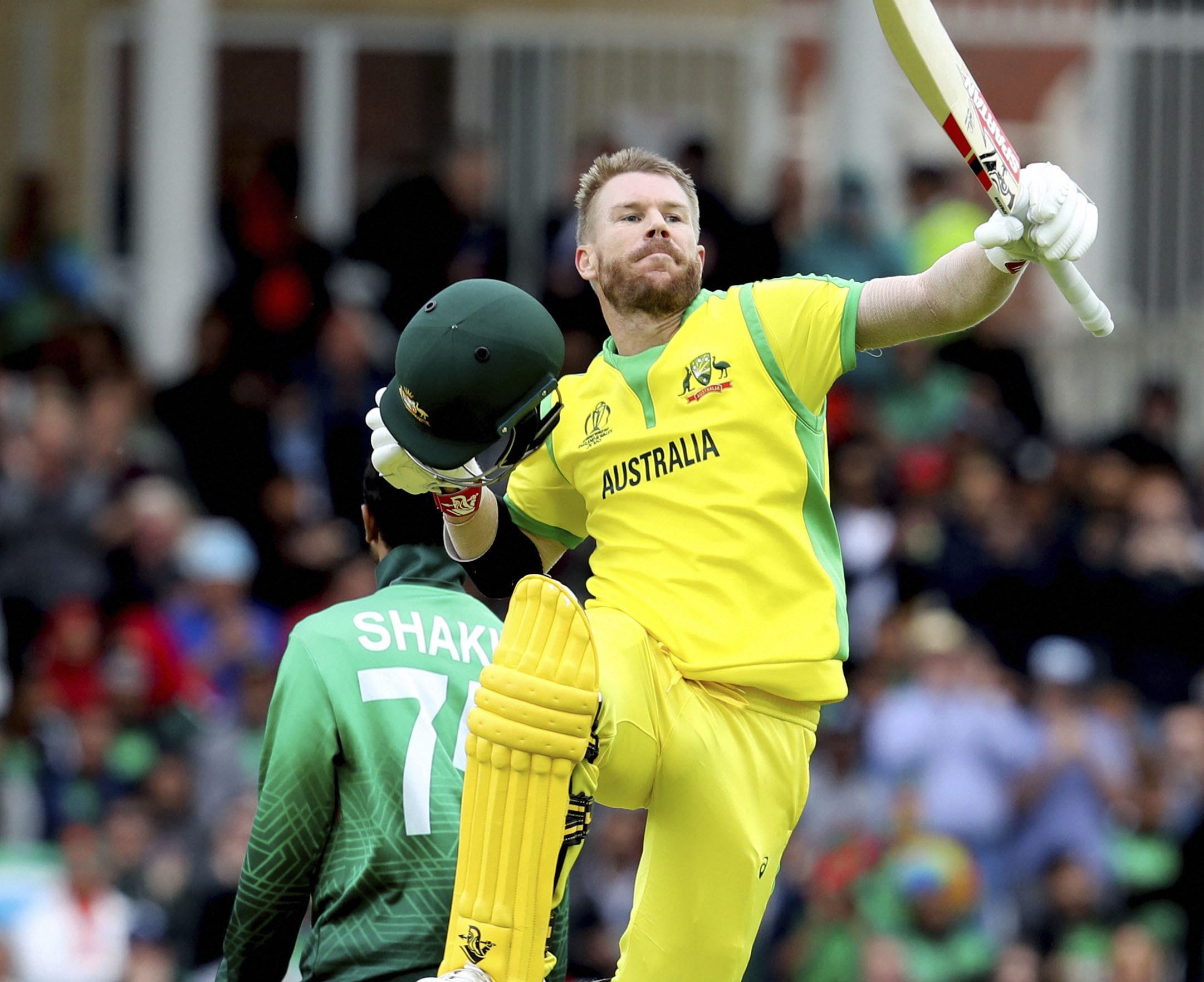 Nottingham: Australia's David Warner leaps in the air to celebrate scoring a century during the Cricket World Cup match between Australia and Bangladesh at Trent Bridge in Nottingham, Thursday, June 20, 2019. AP/PTI(AP6_20_2019_000137B)