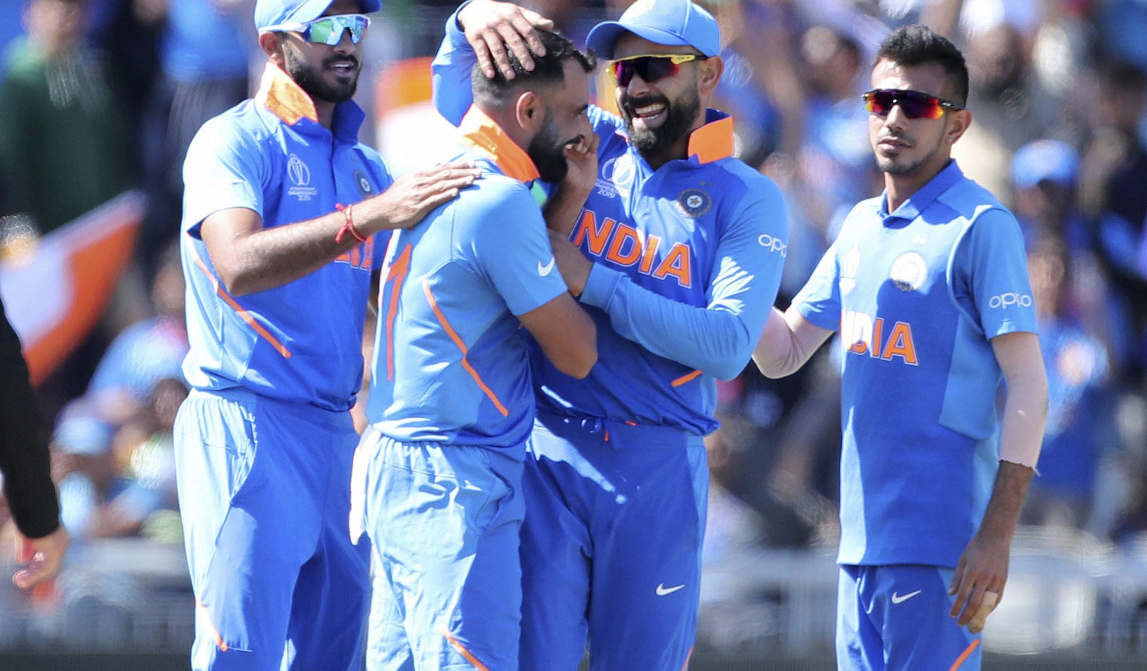 Manchester: India's Mohammed Shami, second left, celebrates with teammates the dismissal of West Indies' Shai Hope during theManchester between India and West Indies at Old Trafford in Manchester, England, Thursday, June 27, 2019.AP/PTI(AP6_27_2019_000229B)