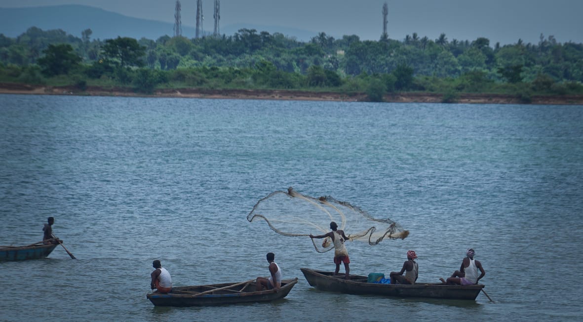 ମହାନଦୀ ତଟରେ ଧୀବରମାନେ ମାଛ ଧରୁଛନ୍ତି।