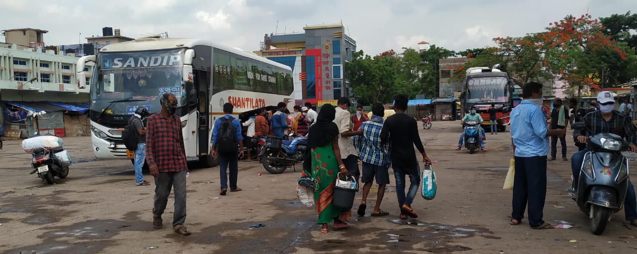 ବାଦାମବାଡ଼ି ବସ୍ଷ୍ଟାଣ୍ଡରୁ ଅଳ୍ପସଂଖ୍ୟକ ବସ୍ ଚଳାଚଳ କରୁଥିବା ବେଳେ ଯାତ୍ରୀମାନେ ସାମାଜିକ ଦୂରତ୍ୱ କଟକଣା ପ୍ରତି ଧ୍ୟାନ ଦେଉନାହାନ୍ତି।