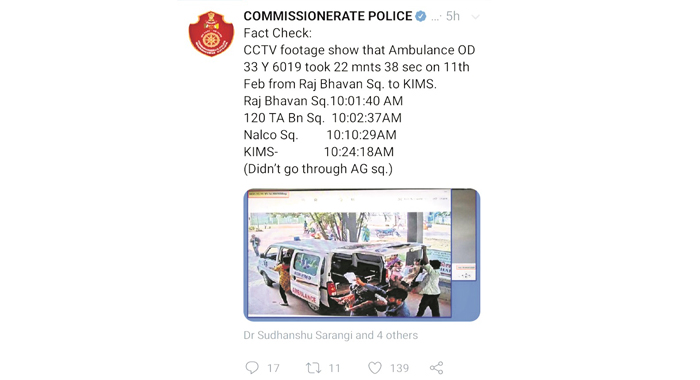 ସୂଚନାଥାଉ କି, ଟ୍ରାଫିକ୍‌ ଭିଡ଼ ଯୋଗୁ ଆମ୍ବୁଲାନ୍ସ ଏକ ଘଣ୍ଟା ୨୦ ମିନିଟ୍‌ରେ କିମ୍ସ ହସ୍ପିଟାଲରେ ପହଞ୍ଚିଥିଲା ବୋଲି ମୃତ ଶିଶୁଙ୍କ ବାପା ନୀରୋଦ ନାୟକ କହିଥିଲେ। ଏନେଇ ବିଭିନ୍ନ ଗଣମାଧ୍ୟମରେ ପ୍ରକାଶିତ ଖବର ମିଥ୍ୟା ବୋଲି ପୋଲିସ କମିଶନର ସୁଧାଂଶୁ ଷଡ଼ଙ୍ଗୀ କହିଛନ୍ତି। ଏପରି କି ସେ ‘ସାମ୍ବାଦିକମାନେ ଜ୍ଞାନୀ ହୁଅନ୍ତୁ, ସବୁଦିଗକୁ ଲକ୍ଷ୍ୟ କରି ଖବର ପରିବେଷଣ କରନ୍ତୁ’ ବୋଲି କହିଛନ୍ତି। ଟୁଇଟ୍‌ରେ ଦର୍ଶାଯାଇଛି ଯେ, ଆମ୍ବୁଲାନ୍ସଟି କ୍ୟାପିଟାଲ ହସ୍ପିଟାଲରୁ ବାହାରି ଏଜି ଛକ ଦେଇ ଯାଇ ନ ଥିଲା। ବରଂ ରାଜଭବନ ଛକରେ ପୂର୍ବାହ୍ନ ୧୦ଟା ୧ ମିନିଟ୍‌ ୪୦ ସେକେଣ୍ଡରେ ଗତି କରିଥିଲା। ସେହଭଳି ୧୨୦ ବାଟାଲିୟନ ଛକରେ ୧୦ଟା ୨ମିନିଟ୍‌ ୩୭ ସେକେଣ୍ଡ ଏବଂ ନାଲ୍‌କୋ ଛକରେ ୧୦ଟା୧୦ ମିନିଟ୍‌ ୨୯ ସେକେଣ୍ଡରେ ପାସ୍‌ କରିଥିଲା। କିମ୍ସରେ ୧୦ଟା ୨୪ ମିନିଟ୍‌ ୧୮ ସେକେଣ୍ଡରେ ପହଞ୍ଚିଥିଲା।