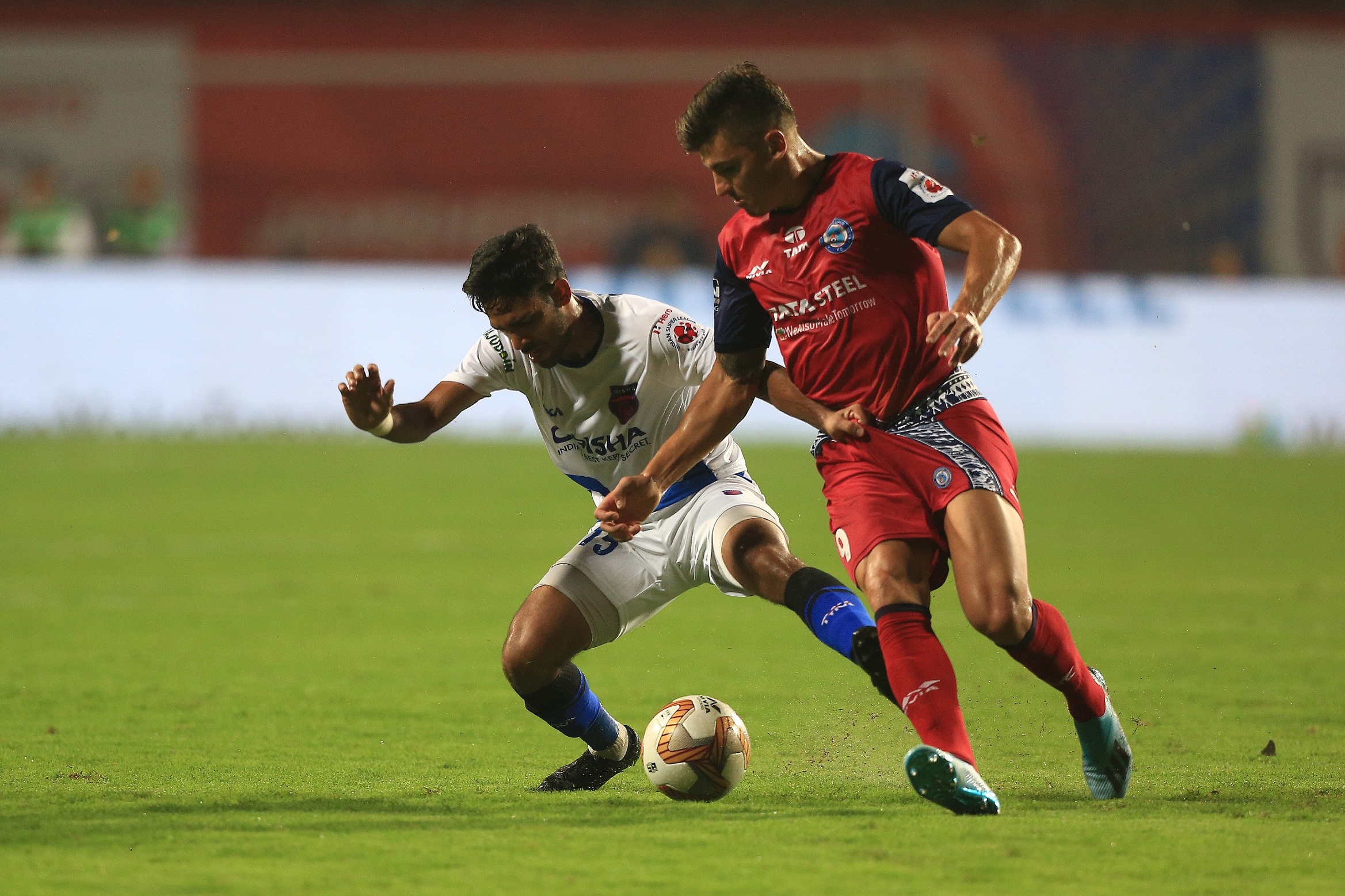 Sergio Castel of Jamshedpur FC and Shubham Sarangi of Odisha FC during match 3 of the Indian Super League ( ISL ) between Jamshedpur FC and Odisha FC held at the JRD Tata Sports Complex, Jamshedpur, India on the 22nd October 2019. Photo by: Arjun Singh / SPORTZPICS for ISL