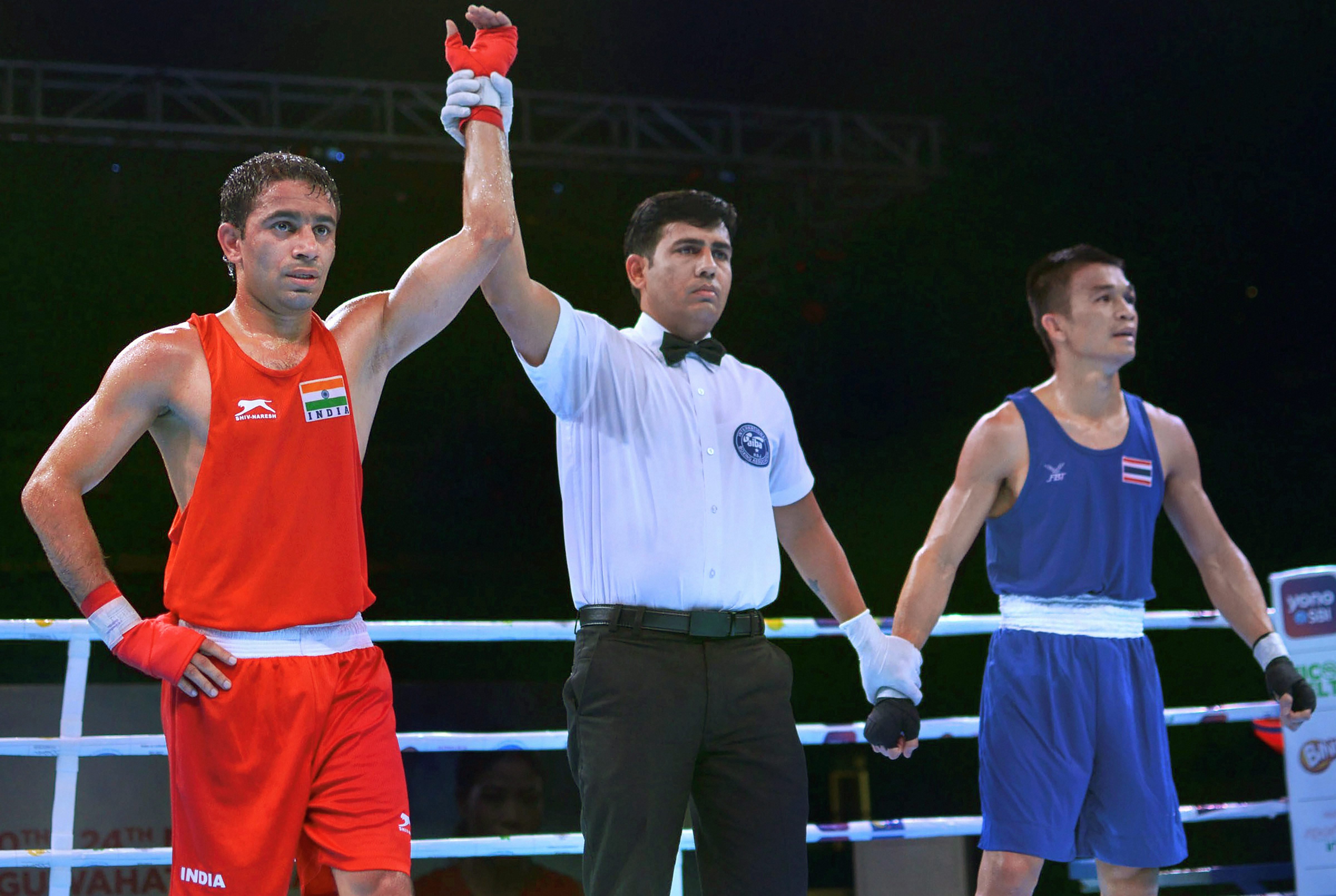 Guwahati: India's Amit Panghal being declared winner against Thailands Chakapong Chanpirom after their bout at the 2nd edition of India Open International Boxing Tournament 2019, in Guwahati, Wednesday, May 22, 2019. (PTI Photo) (PTI5_22_2019_000074B)