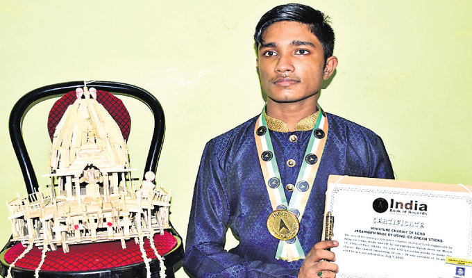 ପୁରୀ ଅଫିସ, ୨୨।୯: ଆଇସ୍କ୍ରିମ କାଠିରେ ମହାପ୍ରଭୁ ଶ୍ରୀଜଗନ୍ନାଥଙ୍କ ନନ୍ଦିଘୋଷ ରଥ ତିଆରି କରି ଇଣ୍ଡିଆ ବୁକ୍ ଅଫ୍ ରେକଡର୍ସରେ ନିଜ ନଁାକୁ ସ୍ଥାନିତ କରିଛନ୍ତି ପୁରୀର ଯୁବ ଶିଳ୍ପୀ ସତ୍ୟପ୍ରକାଶ ନାୟକ। ମାତ୍ର ୧୮ ବର୍ଷ ବୟସରେ ଏହି ସଫଳତା ପାଇଛନ୍ତି କୁଣ୍ଢେଇବେଣ୍ଟ ସାହିର ରାଜଲକ୍ଷ୍ମୀ ଏବଂ ବାଳକୃଷ୍ଣଙ୍କ ପୁଅ ସତ୍ୟପ୍ରକାଶ। ଗତ ଜୁନ୍ ୨୫ରେ ସେ ୬୫୦ ଖଣ୍ଡ କାଠିରେ ୩୮ ସେମି ଉଚ୍ଚତା ଏବଂ ୩୨ ସେମି ଦୈର୍ଘ୍ୟ ଓ ପ୍ରସ୍ଥ ବିଶିଷ୍ଟ କୁନି ରଥକୁ ୫ ଦିନରେ ନିର୍ମାଣ କରିଥିଲେ। ସାରଥୀ, ଘୋଡ଼ା, ପାର୍ଶ୍ୱ ଦେବାଦେବୀ ମଧ୍ୟ ଆଇସ୍କ୍ରିମ କାଠିରେ ତିଆରି କରିଥିଲେ। ଏଥିସହ ଶ୍ରୀଜଗନ୍ନାଥଙ୍କ ପ୍ରତିମୂର୍ତ୍ତିି ଏବଂ ରଥ ଦଉଡ଼ି ତିଆରି କରିଥିଲେ। ରବିବାର ତାଙ୍କ ପାଖରେ ଇଣ୍ଡିଆ ବୁକ୍ ଅଫ୍ ରେକଡର୍ସ ପକ୍ଷରୁ ପଠାଯାଇଥିବା ପ୍ରମାଣପତ୍ର, ପଦକ, ପେନ୍, ପରିଚୟପତ୍ର ଓ ବ୍ୟାଚ୍ ଆଦି ଆସି ପହଞ୍ଚତ୍ଛି। ଏଭଳି ସଫଳତାର ଶ୍ରେୟ ସେ ମହାପ୍ରଭୁ ଏବଂ ମା, ବାପାଙ୍କୁ ଦେଇଛନ୍ତି। ସତ୍ୟପ୍ରକାଶ କହିଛନ୍ତି, ଏଥର କରୋନା ପାଇଁ ରଥଯାତ୍ରାରୁ ବଞ୍ଚତ୍ତ ହୋଇଥିଲି। ତେଣୁ ଆଇସ୍କ୍ରିମ୍ କାଠିରେ ରଥ ଗଢିବାକୁ ସ୍ଥିର କରିଥିଲି।