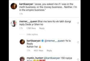 ପ୍ରକୃତ କଥା ହେଲା, ଇନ୍ଷ୍ଟାଗ୍ରାମ୍ରେ ଜଣେ ପ୍ରଶଂସକ କାର୍ତ୍ତିକଙ୍କ ଉତ୍ତରକୁ ଦୀର୍ଘ ଦିନ ହେବ ଅପେକ୍ଷା କରିଥିଲେ। ତେଣୁ ସେ କାର୍ତ୍ତିକଙ୍କୁ ଟ୍ୟାଗ୍ କରି ଲେଖିଛନ୍ତି, ଭାଇ ମୁଁ ତୁମକୁ ୧ ଲକ୍ଷ ଟଙ୍କା ଦେବି, ଭଉଣୀକୁ ଉତ୍ତର ଦିଅ। ପ୍ରଶଂସକଙ୍କ ଏହି ମନ୍ତବ୍ୟ ପରେ କାର୍ତ୍ତିକ ମଧ୍ୟ ଉତ୍ତର ଦେଇଛନ୍ତି। ସେ ଲେଖିଛନ୍ତି, ଏଇ ଉତ୍ତର ଦେଲି, ମୋର ଟଙ୍କା କାହିଁ। ଏହିପରି ଭାବେ କାର୍ତ୍ତିକ ଉତ୍ତର ବଦଳରେ ତାଙ୍କ ପ୍ରଶଂସକଙ୍କୁ ୧ ଲକ୍ଷ ଟଙ୍କା ମାଗିଛନ୍ତି। ଏହି ପୋଷ୍ଟଟି ଏବେ ସୋସିଆଲ ମିଡିଆରେ ଭାଇରାଲ ହେବାରେ ଲାଗିଛି।