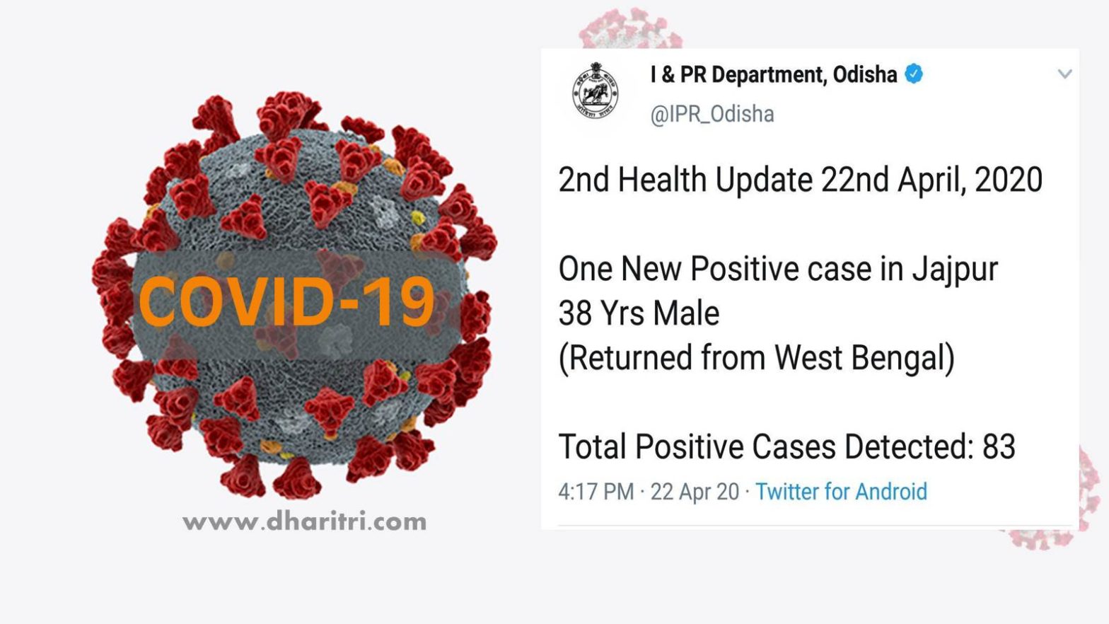 ଭୁବନେଶ୍ୱର, ୨୨।୪(ବ୍ୟୁରୋ): ରାଜ୍ୟରେ ପୁଣି ଜଣେ କରୋନା ଆକ୍ରାନ୍ତ ଚିହ୍ନଟ ହୋଇଛନ୍ତି। ଚିହ୍ନଟ ବ୍ୟକ୍ତିଜଣଙ୍କ ଯାଜପୁରର ୩୮ବର୍ଷୀୟ ଯୁବକ। ସେ ନିକଟରେ ପଶ୍ଚିମବଙ୍ଗରୁ ଫେରିଛନ୍ତି। ତେବେ ଏହାକୁ ମିଶାଇ ବୁଧବାର ୪ଜଣ କରୋନା ଆକ୍ରାନ୍ତ ହୋଇଛନ୍ତି। ସେହିଭଳି ରାଜ୍ୟରେ କରୋନା ଆକ୍ରାନ୍ତଙ୍କ ସଂଖ୍ୟା ୮୩କୁ ବୃଦ୍ଧି ପାଇଥିବା ରାଜ୍ୟ ସୂଚନା ଓ ପ୍ରସାରଣ ବିଭାଗ ପକ୍ଷରୁ ଟୁଇଟ ଯୋଗେ ସୂଚନା ଦିଆଯାଇଛି।