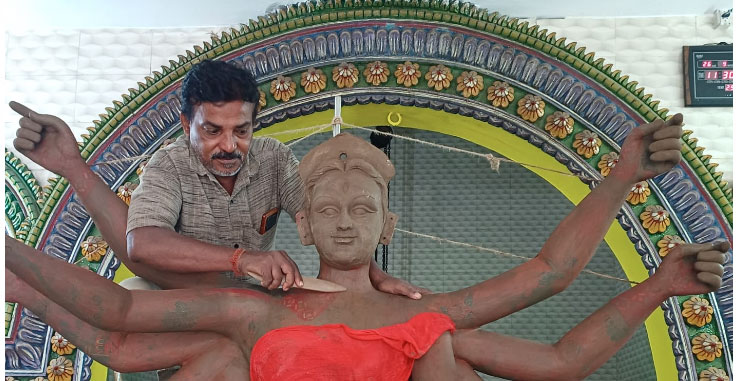 ଶେଖ ବଜ଼ାର ପୂଜା ମଣ୍ଡପରେ ମା ଦୁର୍ଗା ମୁର୍ମୟୀ ପ୍ରତିମା ଗଢୁଥିବା ଶିଳ୍ପୀ