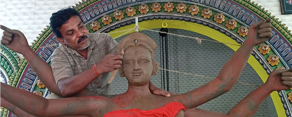 ଶେଖ ବଜ଼ାର ପୂଜା ମଣ୍ଡପରେ ମା ଦୁର୍ଗା ମୁର୍ମୟୀ ପ୍ରତିମା ଗଢୁଥିବା ଶିଳ୍ପୀ