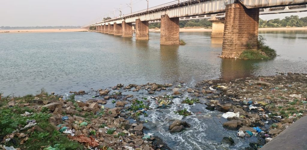 ଜୋବ୍ରା ରେଳୱେ ବ୍ରିଜ୍ ତଳେ ମହାନଦୀ ତଟରୁ ନଦୀର ମଧ୍ୟଭାଗକୁ ଛଡ଼ାଯାଉଥିବା ଆବରଜନାପାଣି