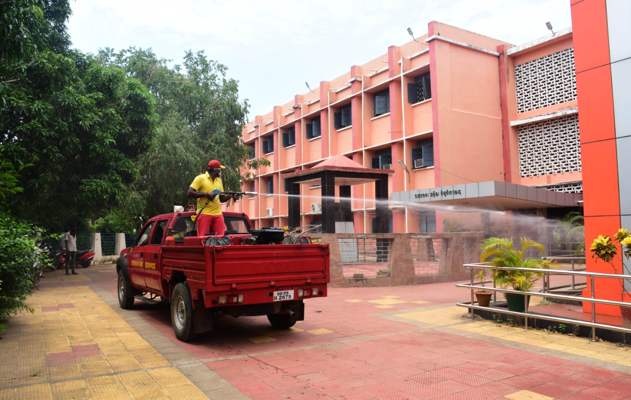 ରମାଦେବୀ ମହିଳା ବିଶ୍ବବିଦ୍ୟାଳୟ କ୍ୟାମ୍ପସରେ ଅଗ୍ନିଶମ କର୍ମଚାରୀ ବିଶୋଧକ ସିଞ୍ଚନ କରୁଛନ୍ତି