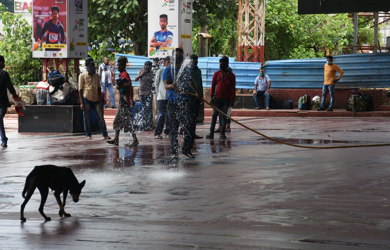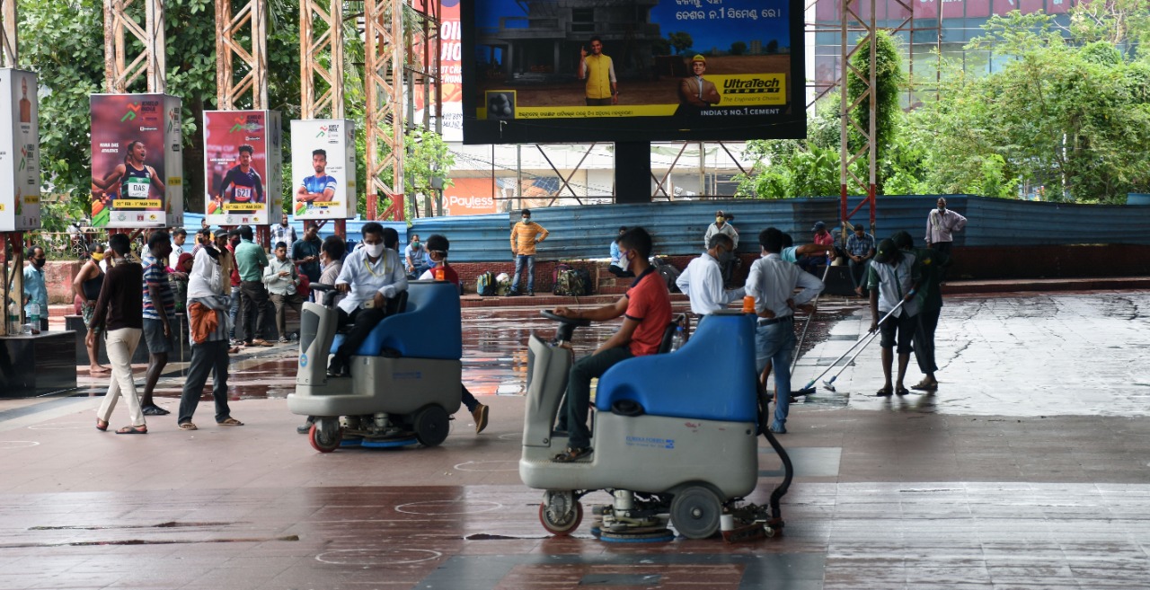 ଭୁବନେଶ୍ୱର ରେଲଓ୍ବେ ଷ୍ଟେଶନ ଯାତ୍ରୀ ଆଶ୍ରୟସ୍ଥଳୀକୁ କର୍ମଚାରୀମାନେ ସଫେଇ କରୁଛନ୍ତି।