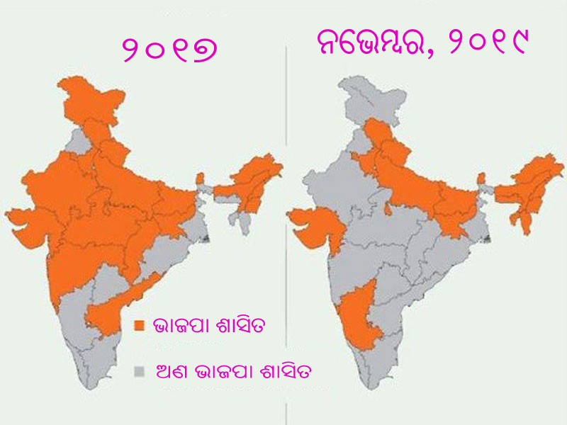 ନୂଆଦିଲ୍ଲୀ,୨୭।୧୧: ଧୀରେଧୀରେ ଏନ୍ଡିଏ ଶାସିତ ରାଜ୍ୟ ସଂଖ୍ୟା କମିବାରେ ଲାଗିଛି। ୨୦୧୭ରେ ଏନ୍ଡିଏ ଦେଶର ୭୨ ପ୍ରତିଶତ ଅଞ୍ଚଳରେ ଶାସନରେ ଥିବାବେଳେ ନଭେମ୍ବର ୨୦୧୯ ସୁଦ୍ଧା ଏହା ୪୧ ପ୍ରତିଶତକୁ ଖସି ଆସିଛି। ଗତ ୧୧ ମାସ ମଧ୍ୟରେ ଏନ୍ଡିଏ ହାତରୁ ମଧ୍ୟପ୍ରଦେଶ, ରାଜସ୍ଥାନ, ଛତିଶଗଡ଼ ଏବଂ ମହାରାଷ୍ଟ୍ର ଆଦି ୪ ବଡ଼ ରାଜ୍ୟରେ ଏନ୍ଡିଏ କ୍ଷମତା ହରାଇଛି। ଏବେ ୧୭ଟି ରାଜ୍ୟରେ ଏନ୍ଡିଏ ସରକାର ରହିଛି। ସେଥି ମଧ୍ୟରୁ ୧୩ରେ ଭାଜପା ଶାସନ କରୁଥିବାବେଳେ ୪ଟି ରାଜ୍ୟରେ ମେଣ୍ଟ ସରକାର ଶାସନ ଡୋରି ଧରିଛନ୍ତି। ଏସବୁ ରାଜ୍ୟରେ ଭାଜପା ସହଯୋଗୀ ଦଳରର ମୁଖ୍ୟମନ୍ତ୍ରୀ ଶାସନ କରୁଛନ୍ତି। ତାମିଲନାଡୁରେ ଭାଜପା ସହଯୋଗରେ ସରକାର ଗଠନ କରାଯାଇଛି। ତେବେ ଏଠାରେ ଭାଜପାର କୌଣସି ବିଧାୟକ ନାହାଁନ୍ତି।