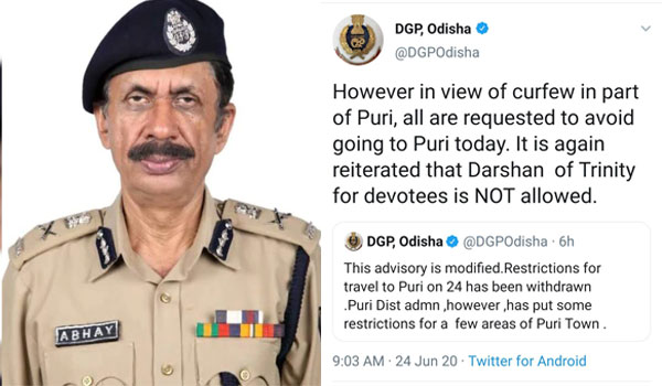 କଟକ ଅଫିସ,୨୪।୬: ବହୁ ବିବାଦ ପରେ ମଙ୍ଗଳବାର ଶାନ୍ତି ଶୃଙ୍ଖଳାର ସହ ପୁରୀରେ ବିଶ୍ୱ ପ୍ରସିଦ୍ଧ ରଥଯାତ୍ରା ଅନୁଷ୍ଠିତ ହୋଇଯାଇଛି। ସୁପ୍ରିମକୋର୍ଟଙ୍କ ନିର୍ଦ୍ଦେଶ କ୍ରମେ ରଥଯାତ୍ରା ଅବସରରେ ପୁରୀରେ କର୍ଫ୍ୟୁ ଜାରି କରାଯାଇଛି। ସୋମବାର, ମଙ୍ଗଳବାର ଏବଂ ବୁଧବାର ପାଇଁ ପୁରୀକୁ ପ୍ରବେଶ ଉପରେ କଟକଣା ଲାଗୁ କରାଯାଇଛି। ତେବେ ମଙ୍ଗଳବାର ରଥଯାତ୍ରା ଶେଷ ହେବା ପରେ ବୁଧବାର ପାଇଁ ପ୍ରବେଶ କଟକଣାରେ ଅନେକ କୋହଳ କରାଯାଇଛି। କିନ୍ତୁ ପୁରୀ ଜିଲା ପ୍ରଶାସନ ପକ୍ଷରୁ କେତେକ କଟକଣା ଜାରିରହିଛି। କଟକଣା କୋହଳ ସତ୍ତ୍ୱେ ପୁରୀ ନ ଯିବା ପାଇଁ ଜନ ସାଧାରଣଙ୍କୁ ନିବେଦନ କରିଛନ୍ତି ରାଜ୍ୟ ପୋଲିସ ମହାନିର୍ଦ୍ଦେଶକ ଅଭୟ। ତିନି ଠାକୁରଙ୍କ ଦର୍ଶନ ପାଇଁ ଭକ୍ତଙ୍କୁ ବାରଣ କରାଯାଇଛି। ଏଣୁ ପୁରୀ ନ ଯିବା ପାଇଁ ଡିଜିପି ଅଭୟ ଅନୁରୋଧ କରିଛନ୍ତି।