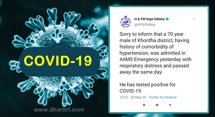 ଭୁବନେଶ୍ୱର, ୨୦।୫(ବ୍ୟୁରୋ): ରାଜ୍ୟରେ ବୁଧବାର ଆଉ ଜଣେ କରୋନା ଆକ୍ରାନ୍ତଙ୍କ ମୃତ୍ୟୁ ଘଟିଛି। ମୃତକ ଜଣଙ୍କ ଖୋର୍ଦ୍ଧା ଜିଲାର। ତାଙ୍କ ବୟସ ୭୦ ବର୍ଷ ବୋଲି ଜଣାପଡ଼ିଛି। ଏ ନେଇ ରାଜ୍ୟ ସ୍ବାସ୍ଥ୍ୟ ବିଭାଗ ପକ୍ଷରୁ ସୂଚନା ମିଳିଛି। ଏହାକୁ ମିଶାଇ ରାଜ୍ୟରେ ମୃତ୍ୟୁ ସଂଖ୍ୟା ୬କୁ ବୃଦ୍ଧି ପାଇଛି।