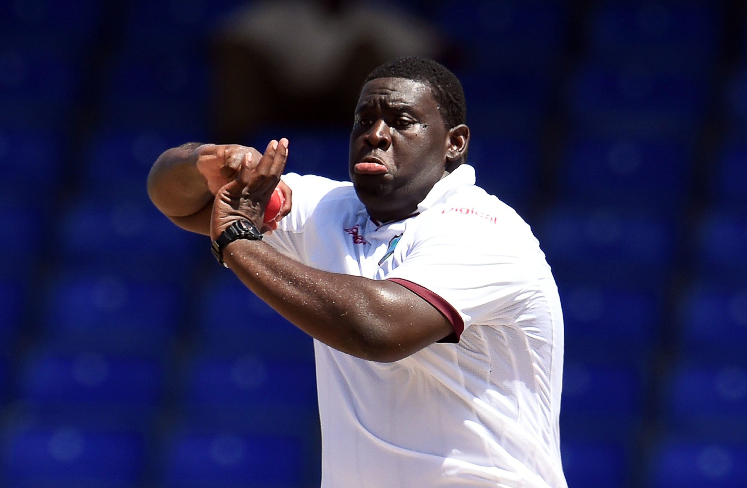 WICB President's XI squad cricketer Rahkeem Cornwall delivers a ball during Day 2 of the three-day tour match between India and WICB President's XI squad at the Warner Park stadium in Basseterre, Saint Kitts, on July 15, 2016. / AFP / Jewel SAMAD (Photo credit should read JEWEL SAMAD/AFP/Getty Images)