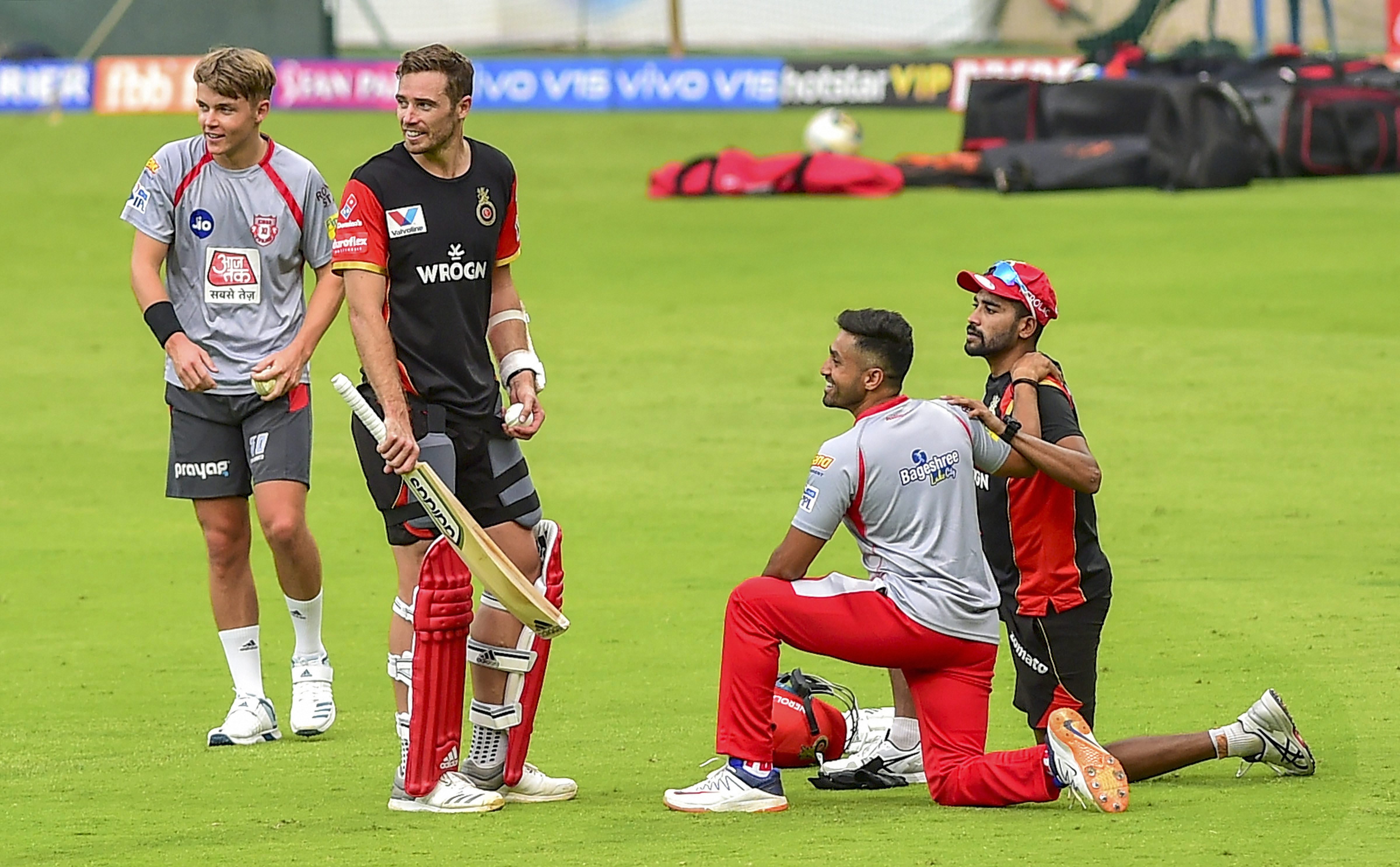 Bengaluru: KXIP players Karun Nair, Sam Curran with RCB players Tim Southee and Mohammed Siraj during a training session ahead of the Indian Premier League 2019 (IPL T20) cricket match between Royal Challengers Bangalore (RCB) and Kings XI Punjab (KXIP), at Chinnaswamy Stadium in Bengaluru, Tuesday, April 23, 2019. (PTI Photo/Shailendra Bhojak) (PTI4_23_2019_000287B)