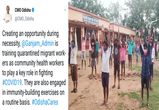 ଛତ୍ରପୁର, ୧୩।୫(ଡି.ଏନ୍.ଏ.)-ଗଞ୍ଜାମ ଜ଼ିଲାର କ୍ୱାରାଣ୍ଟାଇନ ସେଣ୍ଟରରେ ଥିବା ପ୍ରବାସୀ ଶ୍ରମିକମାନଙ୍କୁ କମ୍ୟୁନିଟି ସ୍ବାସ୍ଥ୍ୟକର୍ମୀ ତାଲିମ ପ୍ରଦାନ କରାଯାଉଛି । କ୍ୱାରାଣ୍ଟାଇନ ଅବଧି ସରିବା ପରେ ଉକ୍ତ ତାଲିମପ୍ରାପ୍ତ ପ୍ରବାସୀ ଶ୍ରମିକମାନେ କରୋନା ମୁକାବିଲାରେ ସାମିଲ ହୋଇ କମ୍ୟୁନିଟି ସ୍ବାସ୍ଥ୍ୟ ଅଧିକାରୀ ଭାବେ କାମ କରିବେ। ଏଥିସହ କ୍ୱାରାଣ୍ଟାଇନ ସେଣ୍ଟରରେ ପ୍ରବାସୀ ଶ୍ରମିକ ଓ ତାଙ୍କ ପରିବାର ସଦସ୍ୟ ବ୍ୟାୟାମ, ଯୋଗ କରୁଛନ୍ତି। ଏହାଦ୍ୱାରା ସେମାନଙ୍କର ରୋଗ ପ୍ରତିରୋଧକ ଶକ୍ତି ବଢିବ। ଏଥିସହ କରୋନା ଯୁଦ୍ଧରେ କମ୍ୟୁନିଟି ସ୍ବାସ୍ଥ୍ୟକର୍ମୀଙ୍କ ଭୂମିକା ରହିବ ବୋଲି ମୁଖ୍ୟମନ୍ତ୍ରୀ ନବୀନ ପଟ୍ଟନାୟକ ଟୁଇଟ କରିଛନ୍ତି। ଏଥିପାଇଁ ସେ ଗଞ୍ଜାମ ଜିଲା ପ୍ରଶାସନର ପ୍ରଶଂସା କରିଛନ୍ତି।
