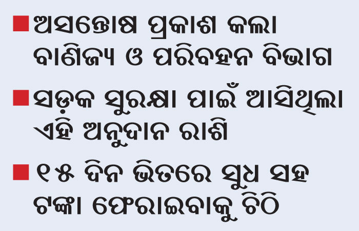 କଟକ ଅଫିସ,୨।୬: ଗୋଟିଏ ପଟେ ରାଜ୍ୟରେ ସଡ଼କ ଦୁର୍ଘଟଣା ପ୍ରତି ବର୍ଷ ବଢୁଥିବା ବେଳେ ଏହାକୁ ରୋକିବାରେ ପୋଲିସ ଏକପ୍ରକାର ବିଫଳ ହେଉଛି। ଅନ୍ୟପଟେ ସଡ଼କ ସୁରକ୍ଷା ଦିଗରେ ପଦକ୍ଷେପ ପାଇଁ ମିଳିଥିବା ଟଙ୍କାକୁ ମଧ୍ୟ ଖର୍ଚ୍ଚ କରିପାରୁନାହିଁ। ସଡ଼କ ସୁରକ୍ଷା ଦିଗରେ ବିଭିନ୍ନ ପଦକ୍ଷେପ ପାଇଁ ବାଣିଜ୍ୟ ଓ ପରିବହନ ବିଭାଗ ରାଜ୍ୟ ପୋଲିସକୁ ଅର୍ଥ ଦିଏ। ୨୦୧୬ରେ ଏଥିପାଇଁ ଯେଉଁ ଅର୍ଥ ଆସିଥିଲା, ତାହା ଖର୍ଚ୍ଚ ନ ହୋଇ ପଡ଼ିରହିଛି। ଏନେଇ ବାଣିଜ୍ୟ ଓ ପରିବହନ ବିଭାଗ ଅସନ୍ତୁଷ୍ଟ ହେବା ସହ ପଡ଼ିରହିଥିବା ୧ କୋଟି ୭ ଲକ୍ଷ ଟଙ୍କା ଓ ଏହାର ସୁଧ ସହ ଫେରାଇବା ପାଇଁ ରାଜ୍ୟ ପୋଲିସ ମହାନିର୍ଦ୍ଦେଶକଙ୍କୁ ଚିଠି କରିଛି। ୧୫ଦିନ ଭିତରେ ଟଙ୍କା ଫେରାଇବାକୁ ଚିଠିରେ ଉଲ୍ଲେଖ ରହିଛି।