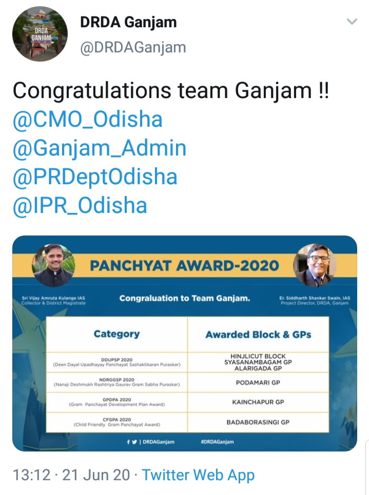 ଛତ୍ରପୁର,୨୧।୬(ଡି.ଏନ୍‌.ଏ): ଗଞ୍ଜାମ ଜିଲାର ହିଞ୍ଜିଳି ବ୍ଲକ ଓ ୫ ଟି ପଞ୍ଚାୟତକୁ ଜାତୀୟ ପଞ୍ଚାୟତ ପୁରସ୍କାର -୨୦୨୦ ମିଳିଛି। ଏ ନେଇ ଗଞ୍ଜାମ ଜିଲାପାଳ ବିଜୟ ଅମୃତା କୁଲାଙ୍ଗେ ଓ ଡିଆର୍‌ଡିଏ ପିଡି ଇଂ ସିଦ୍ଧାର୍ଥ ଶଙ୍କର ସ୍ବାଇଁ ଟୁଇଟ କରି ଗଞ୍ଜାମ ଟିମ୍‌କୁ ଶୁଭେଚ୍ଛା ଜଣାଇଛନ୍ତି। ହିଞ୍ଜିଳି ବ୍ଲକ, ଶେରଗଡ଼ ବ୍ଲକ ଅଧୀନ ଅଲାରିଗଡ଼ ପଞ୍ଚାୟତ ଓ ହିଞ୍ଜିଳି ବ୍ଲକ ଅଧୀନ ଶାସନ ଆମ୍ବଗାଁ ପଞ୍ଚାୟତକୁ ଦୀନଦୟାଲ ଉପାଧ୍ୟାୟ ପଞ୍ଚାୟତ ସଶକ୍ତିକରଣ ପୁରସ୍କାର କେନ୍ଦ୍ର ସରକାରଙ୍କଠାରୁ ମିଳିଛି ସେହିପରି ପୋଡାମାରି ପଞ୍ଚାୟତକୁ ନାନାଜି ଦେଶମୁଖ ରାଷ୍ଟ୍ରୀୟ ଗୌରବ ଗ୍ରାମସଭା ପୁରସ୍କାର, ଗଞ୍ଜାମ ବ୍ଲକ କାଇଁଚପୁର ପଞ୍ଚାୟତକୁ ଗ୍ରାମପଞ୍ଚାୟତ ପ୍ଲାନ ଆୱାର୍ଡ ଏବଂ ବଡବୋରସିଙ୍ଗ ପଞ୍ଚାୟତକୁ ଚାଇଲଡ ଫ୍ରେନ୍ଡଲି ଗ୍ରାମପଞ୍ଚାୟତ ଆୱାର୍ଡ କେନ୍ଦ୍ର ସରକାରଙ୍କ ଠାରୁ ମିଳିଛି।