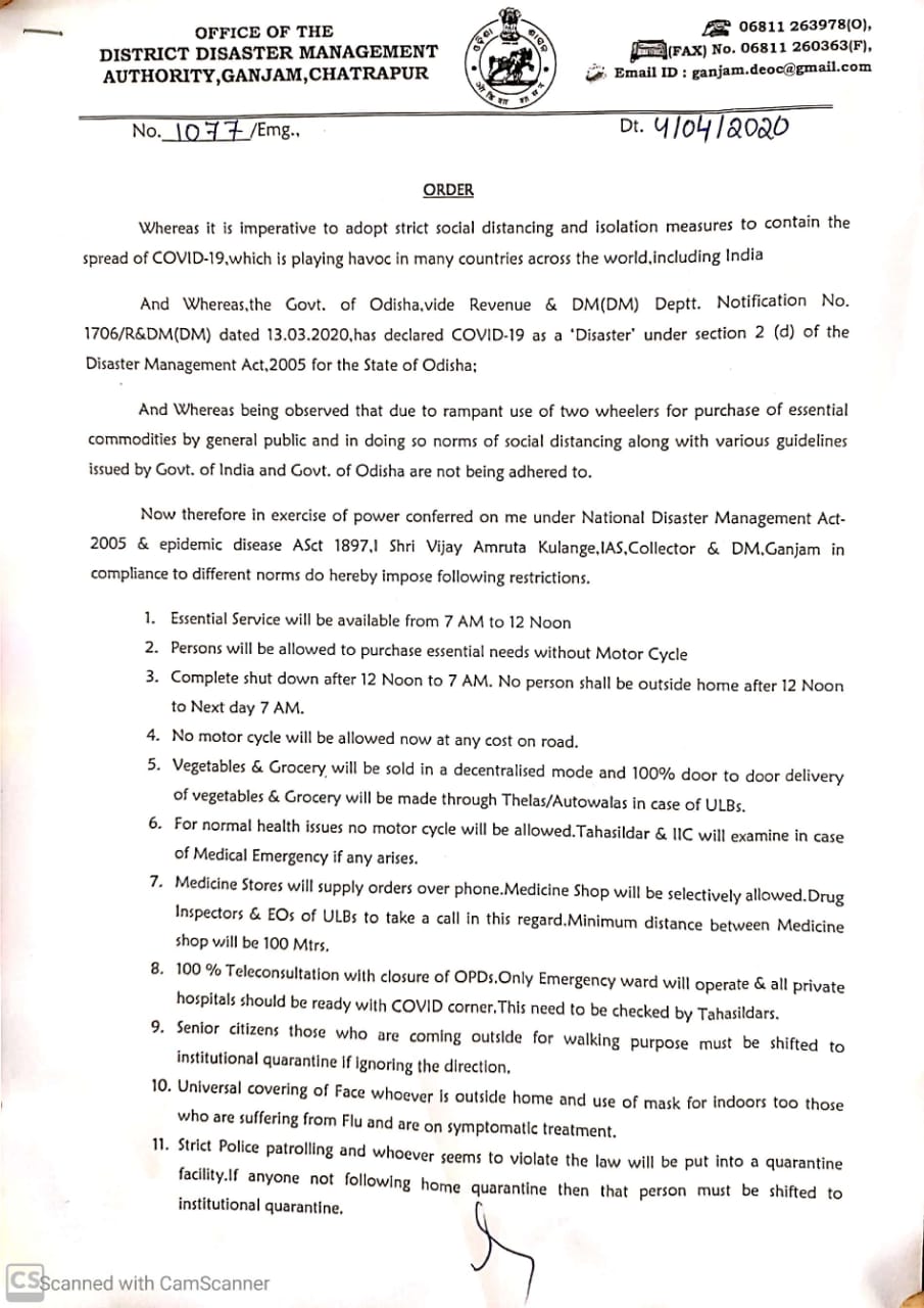 ଛତ୍ରପୁର, ୪।୪(ଡି.ଏନ.ଏ .)- ରାଜ୍ୟରେ କରୋନାର ଭୟାବହତାକୁ ଦୃଷ୍ଟିରେ ରଖି ଗଞ୍ଜାମ ଜିଲା ପ୍ରଶାସନ ତାଲା ବନ୍ଦ ପରିପ୍ରେକ୍ଷିରେ ଅଧିକ କଠୋର କଟକଣା ଜାରି କରିଛନ୍ତି । ଜିଲାପାଳ ବିଜୟ ଅମୃତା କୁଲାଙ୍ଗେ ୧୯ ଘଣ୍ଟିଆ ସଟ୍ଡାଉନ ନିର୍ଦ୍ଦେଶ ଜାରି କରିଛନ୍ତି। ଦିନ ୧୨ଟାରୁ ସକାଳ ୭ଟା ପର୍ଯ୍ୟନ୍ତ ଶର୍ଟଡାଉନ କଟକଣା ରହିବ। ଆଦେଶ ମତେ ପୋଲିସ୍ ପାଟ୍ରୋଲିଂ ଅଧିକ କଡାକଡି କରିବାକୁ ଜିଲାପାଳ ନିର୍ଦ୍ଦେଶ ଦେଇଛନ୍ତି। ବାହାରେ ବୁଲୁଥିବା ଯେ କୌଣସି ବ୍ୟକ୍ତିଙ୍କୁ ପୋଲିସ୍ ଥାନାକୁ ଉଠାଇନେବ । ସ୍ଥଳ ବିଶେଷରେ ସେମାନଙ୍କ ବିରୁଦ୍ଧରେ ମହାମାରୀ ରୋଗ ନିୟମ ମୁତାବକ ମାମଲା ଦାୟର କରାଯିବ। ଗଣମାଧ୍ୟମକୁ ଏଥିରୁ ବାଦ୍ ଦିଆଯାଇଛି। ପ୍ରତ୍ୟହ ମଧ୍ୟାହ୍ନ ୧୨ଘଣ୍ଟା ଠାରୁ ପରଦିନ ସକାଳ ୭ଘଣ୍ଟା ପର୍ଯ୍ୟନ୍ତ କୌଣସି ବ୍ୟକ୍ତିକୁ ବାହାରକୁ ବାହାରିବା ପାଇଁ ସମ୍ପୂର୍ଣ୍ଣ ନିଷେଧ କରାଯାଇଛି। କୌଣସି ମଟର ସାଇକେଲ ଏହି ସମୟ ମଧ୍ୟରେ ରାସ୍ତାକୁ ବାହାରି ପାରିବେ ନାହିଁ। ଜିଲାର କୌଣସି ଠାରେ କୌଣସି ଦୋକାନ ଏହି ସମୟ ମଧ୍ୟରେ ଖୋଲାଯାଇ ପାରିବ ନାହିଁ। ଔଷଧ ଦୋକାନ ଯେଉଁ ଗୁଡିକୁ ପ୍ରଶାସନ ଅନୁମତି ପ୍ରଦାନ କରିଥିବ ସେହି ଗୁଡିକ କେବଳ ଖୋଲାଯାଇ ପାରିବ। ଏଥିପାଇଁ ସ୍ଥାନୀୟ ଡ଼୍ରଗ୍ ଇନ୍ସପେକ୍ଟର କିମ୍ବା ସହରାଞ୍ଚଳ ନିର୍ବାହୀ ଅଧିକାରୀ ଅନୁମତି ପ୍ରଦାନ କରିବା ଆବଶ୍ୟକ। ଯେଉଁ ଔଷଧ ଦୋକାନ ଗୁଡିକ ଖୋଲା ରହିବ ତାହା ପରସ୍ପର ଠାରୁ ଅନ୍ତତଃ ୧୦୦ ମିଟର ଦୂରତ୍ବ ବଜାୟ ରଖିବେ। ଟେଲିଫୋନ୍ ଯୋଗାଯୋଗ ଦ୍ବାରା ଔଷଧ ପ୍ରଦାନ କରାଯାଇପାରିବ। ଶତ ପ୍ରତିଶତ ରୋଗୀ ସେବା ଟେଲିଫୋନ୍ ମାଧ୍ୟମରେ ପରିଚାଳନା କରିବାପାଇଁ କୁହାଯାଇଛି। ଡାକ୍ତର ଖାନାରେ ଜରୁରୀକାଳିନ ଓ୍ବାର୍ଡ କାର୍ଯ୍ୟକ୍ଷମ ରହିବ। ସମସ୍ତ ଘରୋଇ ଡାକ୍ତରଖାନା କରୋନା ରୋଗୀଙ୍କ ପାଇଁ ପ୍ରସ୍ତୁତ ହୋଇ ରହିବ। ସ୍ଥାନୀୟ ତହସିଲଦାର ଏହାର ତଦାରଖ କରିବେ। କୌଣସି ରୋଗୀ ତହସିଲଦାର କିମ୍ବା ଥାନା ଭାରପ୍ରାପ୍ତ ଅଧିକାରୀଙ୍କ ନିର୍ଦ୍ଦେଶ ବିନା ଡାକ୍ତରଖାନାକୁ ମୋଟରସାଇକେଲରେ ଆସିପାରିବେ ନାହିଁ। ନିଜ ଘରେ କ୍ବାରାଣ୍ଟାଇନ୍ରେ ଥିବା କୌଣସି ବ୍ୟକ୍ତି ବାହାରେ ବୁଲିଲେ ତାଙ୍କୁ ତୁରନ୍ତ ନେଇ ପ୍ରଶାସନିକ କ୍ବାରାଣ୍ଟାଇନ୍ କେନ୍ଦ୍ରରେ ରଖାଯିବ। ବୟସ୍କ ବ୍ୟକ୍ତିମାନଙ୍କୁ ବାହାରେ ବୁଲିବାପାଇଁ ନିଷେଧ କରାଯାଇଛି। ଅବମାନନା କଲେ ସେମାନଙ୍କୁ ମଧ୍ୟ କ୍ବାରାଣ୍ଟାଇନ୍ କେନ୍ଦ୍ରକୁ ସ୍ଥାନାନ୍ତରିତ କରାଯିବ। କୌଣସି ବ୍ୟକ୍ତି ବାହାରକୁ ବାହାରିଲେ ତାଙ୍କର ମୁହଁକୁ ସମ୍ପୂର୍ଣ୍ଣ ଆବୃତ୍ତ କରି ରଖିବେ । ଯେଉଁମାନେ ଥଣ୍ଡା କିମ୍ବା କାଶରେ ଆକ୍ରାନ୍ତ ସେମାନେ ନିଜଘରେ ମଧ୍ୟ ମୁହ୍ଁକୁ ଆବୃତ କରି ରଖିବେ।