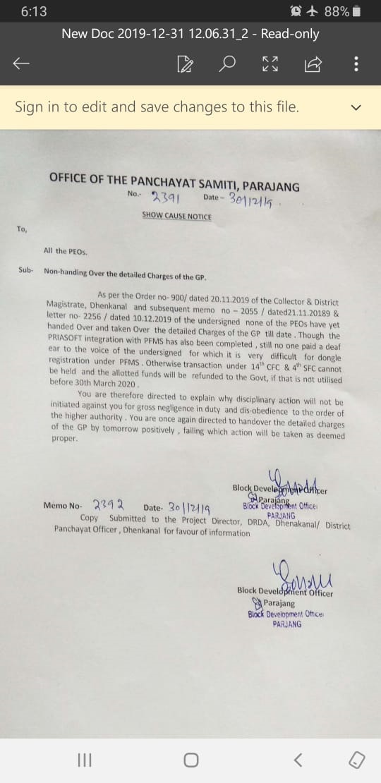 ପରଜଙ୍ଗ, ୩।୧(ଡି.ଏନ.ଏ.) – ପ୍ରଧାନମନ୍ତ୍ରୀ ଆବାସ ଯୋଜନାରେ କେଳେଙ୍କାରୀକୁ ନେଇ ସୃଷ୍ଟି ହୋଇଥିବା ତୁମ୍ବିତୋଫାନ ନ ଥମୁଣୁ ପରଜଙ୍ଗ ବ୍ଲକରେ ଏବେ ଭତ୍ତା ବଣ୍ଟନ ବ୍ୟବସ୍ଥାରେ ଅନିୟମିତତା ହୋଇଥିବା ଅଭିଯୋଗ ହୋଇଛି। ଗେଙ୍ଗୁଟିଆ ପଞ୍ଚାୟତର ହିତାଧିକାରୀଙ୍କୁ ଡିସେମ୍ବର ମାସର ଭତ୍ତା ମିଳିନାହିଁ। ଭତ୍ତା ବାବଦ ଟଙ୍କା ଜଏଣ୍ଟ ଆକାଉଣ୍ଟରୁ ଉଠାଯାଇଥିବାବେଳେ ବଣ୍ଟା ନ ଯିବା ସାଧାରଣରେ ପ୍ରଶ୍ନବାଚୀ ସୃଷ୍ଟି କରିଛି। ଏ ନେଇ ଅଭିଯୋଗ ହେବା ପରେ ବିଡିଓ ସମ୍ପୃକ୍ତ ପଞ୍ଚାୟତର ପିଇଓଙ୍କୁ ଗତ ୧୫ ତାରିଖରେ କାରଣ ଦର୍ଶାଅ ନୋଟିସ୍ ଜାରି କରିଛନ୍ତି। ହେଲେ ଅଦ୍ୟାବଧି ଏହାର ଉତ୍ତର ମିଳିନାହିଁ। ଅନ୍ୟପଟେ ଏଥିରେ ଘୋଟାଲା ହୋଇଥିବା ସନ୍ଦେହ କରି ଭତ୍ତାରୁ ବଞ୍ଚତ୍ତ ହିତାଧିକାରୀ ଜିଲା ପ୍ରଶାସନର ହସ୍ତକ୍ଷେପ ଲୋଡ଼ିଛନ୍ତି।