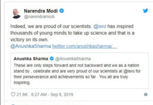 ଭାରତର ‘ଚନ୍ଦ୍ରଯାନ -୨’ ମିଶନ ବିଫଳ ହୋଇଛି। ଲ୍ୟାଣ୍ଡ୍ର ବିକ୍ରମ ଚନ୍ଦ୍ରପୃଷ୍ଠକୁ ଛୁଇଁବା ପାଇଁ ୨.୧ କିମି ଦୂରତା ଥିବାବେଳେ ଇସ୍ରୋ ବୈଜ୍ଞାନିକଙ୍କଠାରୁ ଯୋଗାଯୋଗ ବିଚ୍ଛିନ୍ନ ହୋଇଥିଲା। ଏଥିରେ ସମଗ୍ର ଭାରତବାସୀ ଦୁଃଖ ପ୍ରକାଶ କରିଥିଲେ। ତଥାପି ଇସ୍ରୋ ବୈଜ୍ଞାନିକଙ୍କୁ ପ୍ରଶଂସା କରିବା ସହ ଉତ୍ସାହିତ କରିଥିଲେ ଦେଶବ୍ୟାପୀ ଲୋକ। ବଲିଉଡ୍ର କିଛି ସେଲିବି୍ରିଟି ମଧ୍ୟ ଇସ୍ରୋ ବୈଜ୍ଞାନିକଙ୍କୁ ପ୍ରଶଂସା କରିଥିଲେ। ଅଭିନେତ୍ରୀ ଅନୁଷ୍କା ଶର୍ମା ମଧ୍ୟ ଟୁଇଟ୍ କରି ଇସ୍ରୋ ବୈଜ୍ଞାନିକଙ୍କୁ ପ୍ରଶଂସା କରିଥିଲେ। ସେ ଲେଖିଥିଲେ, ଏହା କେବଳ ଆଗକୁ ଯିବା ପାଇଁ ଆରମ୍ଭ ମାତ୍ର। ଆମର ବୈଜ୍ଞାନିକ ମାନେ ହତୋତ୍ସାହ ନ ହୋଇ ଆଗକୁ ବଢ଼ିବା ଉଚିତ୍। ତାଙ୍କର ଦୃଢ଼ ମନୋବଳ ଏବଂ ଉପଲବ୍ଧି ପାଇଁ ଆମେ ଗର୍ବିତ। ଆପଣ ସମସ୍ତେ ବାସ୍ତବରେ ପ୍ରେରଣାଦାୟକ।
