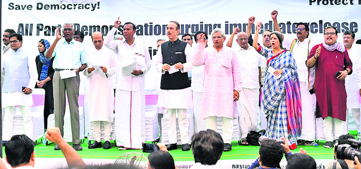 ନୂଆଦିଲ୍ଲୀ, ୨୩ା୮(ପି.ଟି.): ଦିଲ୍ଲୀର ଜନ୍ତର ମନ୍ତରଠାରେ ବିଭିନ୍ନ ବିରୋଧୀ ଦଳର ନେତାମାନେ ବିକ୍ଷୋଭ କରିବା ସହ ଜମ୍ମୁ-କଶ୍ମୀରରେ ଅଟକ ଥିବା ନେତାମାନଙ୍କୁ ତୁରନ୍ତ ମୁକ୍ତ କରିବାକୁ ଦାବି କରିଛନ୍ତି। ଜମ୍ମୁ-କଶ୍ମୀରରେ ଶାନ୍ତି ଫେରାଇଆଣିବା ଓ ଆଇନଶୃଙ୍ଖଳା ରକ୍ଷା କରିବା ଉପରେ ସେମାନେ ଜୋର୍ ଦେଇଛନ୍ତି। କଂଗ୍ରେସ, ତୃଣମୂଳ କଂଗ୍ରେସ, ଡିଏମ୍କେ, ଏସ୍ପି, ସିପିଆଇ, ସିପିଏମ୍ ଆଦି ବିରୋଧୀ ଦଳର ନେତାମାନେ ଏହି ବିକ୍ଷୋଭରେ ସାମିଲ ହୋଇଥିଲେ। ପରେ ପୂର୍ବତନ ଅର୍ଥମନ୍ତ୍ରୀ ତଥା ସିବିଆଇ ଦ୍ୱାରା ଗିରଫ ହୋଇଥିବା ପି. ଚିଦାମ୍ବରମ୍ଙ୍କ ପୁଅ କାର୍ତ୍ତି ସମାନଙ୍କ ସହ ସାମିଲ ହୋଇଥିଲେ। ଜମ୍ମୁ-କଶ୍ମୀରବାସୀଙ୍କ ସହ ବିନା ଆଲୋଚନାରେ ଧାରା ୩୭୦ ଉଠାଯିବାକୁ ଏହି ନେତାମାନେ ବିରୋଧ କରିଥିଲେ।