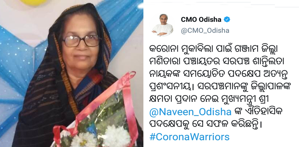 ଛତ୍ରପୁର,୧୧ା୫(ଡି.ଏନ୍.ଏ.): କରୋନା ମୁକାବିଲା ପାଇଁ ଗଞ୍ଜାମ ଜିଲା ବୁଗୁଡ଼ା ବ୍ଲକ ମାଣିତରା ପଞ୍ଚାୟତର ସରପଞ୍ଚ ଶାନ୍ତିଲତା ନାୟକଙ୍କ ସମୟୋଚିତ ପଦକ୍ଷେପକୁ ଟୁଇଟ୍ କରି ପ୍ରଶଂସା କରିଛନ୍ତି ମୁଖ୍ୟମନ୍ତ୍ରୀ ନବୀନ ପଟ୍ଟନାୟକ । ମାଣିତରା ସଙ୍ଗରୋଧ କେନ୍ଦ୍ରରେ ପ୍ରବାସୀ ଓଡ଼ିଆ ରହୁଛନ୍ତି। ଏହି କେନ୍ଦ୍ର ଜନବସତି ଅଞ୍ଚଳରେ ହୋଇଥିବାରୁ କ୍ୱାରାଣ୍ଟାଇନ୍ରେ ଥିବା ଲୋକେ ପାନ ଗୁଟ୍ଖା ଆଦି ପାଇଁ ବେଳେବେଳେ ବାହାରକୁ ଆସୁଥିଲେ। ଏଥିସହ ମାସ୍କ ବ୍ୟବହାର ଓ ସାମାଜିକ ଦୂରତ୍ୱ ବଜାୟ ରଖିବାକୁ ପ୍ରଶାସନ ପକ୍ଷରୁ ସଚେତନ କରାଯାଉଥିଲେ ମଧ୍ୟ ବହୁଲୋକ ମାନୁ ନ ଥିଲେ। ଏଭଳି ସ୍ଥିତିରେ ପଞ୍ଚାୟତରେ କରୋନା ସଂକ୍ରମଣ ଆଶଙ୍କା ଲକ୍ଷ୍ୟ କରି ସରପଞ୍ଚ ଜିଲାପାଳ କ୍ଷମତା ପ୍ରୟୋଗ କରି ଗତ ୯ ତାରିଖରେ ୮ଦିନ ଲାଗି ପୂର୍ବାହ୍ନ ୧୧ଟାରୁ ପରଦିନ ସକାଳ ୭ଟା ପର୍ଯ୍ୟନ୍ତ ଶଟ୍ଡାଉନ୍ ଘୋଷଣା କରିଥିଲେ।