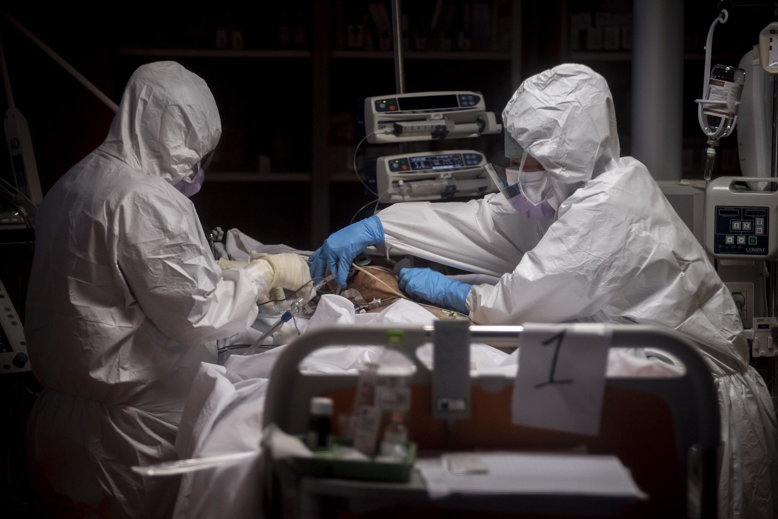 ROME, ITALY - MARCH 26: Doctors treat COVID-19 patients in an intensive care unit at the third Covid 3 Hospital (Istituto clinico CasalPalocco) during the Coronavirus emergency on March 26, 2020, in Rome, Italy. Hospitals in Italy are under increased pressure as they battle to treat those who have contracted COVID-19. The Italian government continues to enforce the nationwide lockdown measures to control the spread of COVID-19. (Photo by Antonio Masiello/Getty Images)