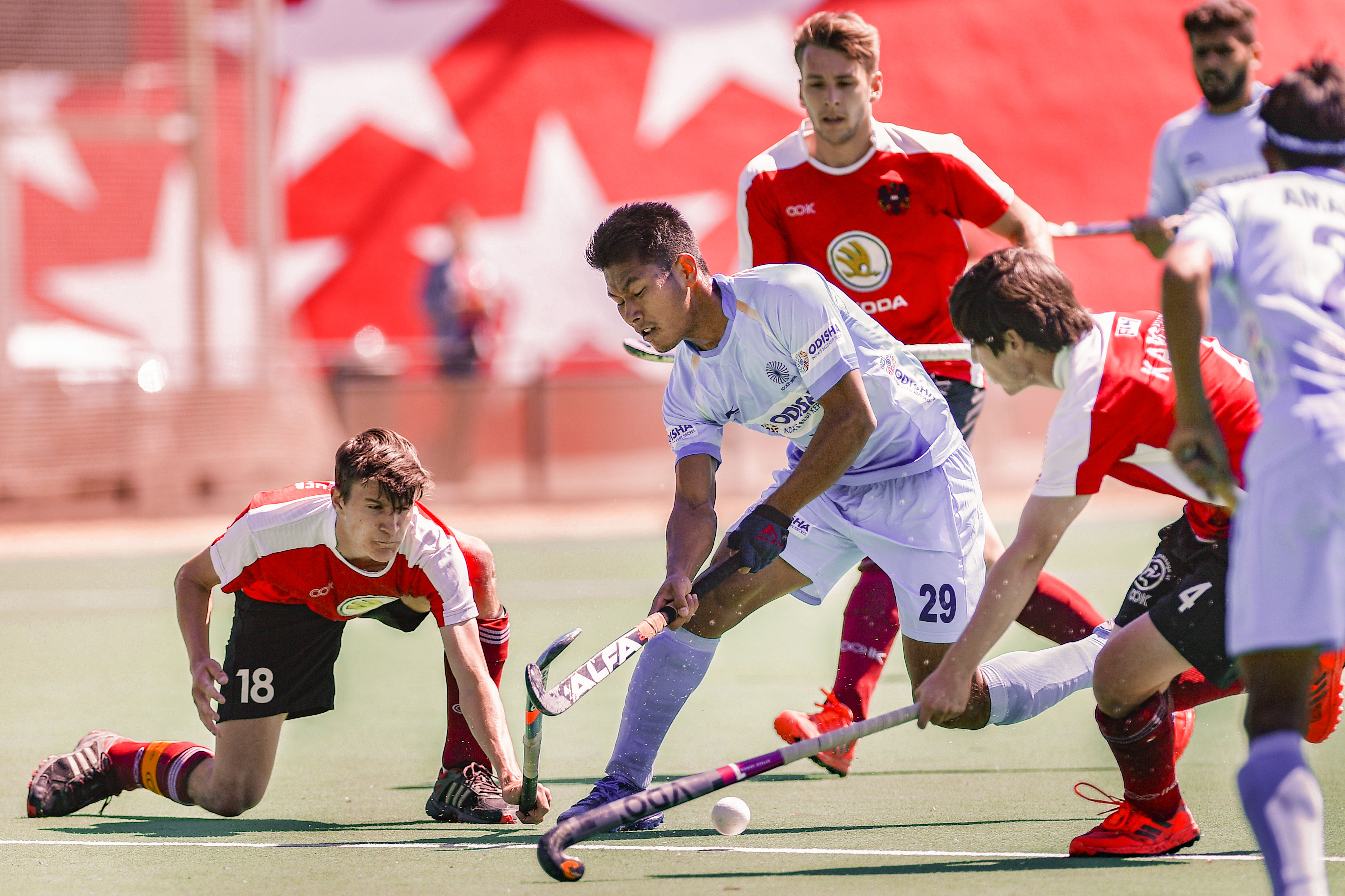 Madrid: Indian Junior Men's Hockey team vies for ball during a match against Austria in 8-Nations U-21 Invitational, in Madrid, Spain, Saturday, June 15, 2019. India beat Austria 4-2 (PTI Photo/Swapan Mahapatra) (PTI6_15_2019_000120B)