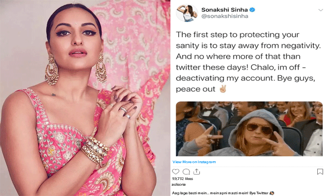 ବମ୍ବେ: ଟୁଇଟର୍ ଛାଡ଼ିଲେ ବଲିଉଡ୍ ଅଭିନେତ୍ରୀ ତଥା ଦବଙ୍ଗ ଗର୍ଲ ସୋନାକ୍ଷୀ ସିନ୍ହା। ନିଜର ଇନ୍ଷ୍ଟାଗ୍ରାମରେ ଏକ ପୋଷ୍ଟ ଶେୟାର କରି ସେ ଏହାକୁ ସ୍ପଷ୍ଟ କରିଛନ୍ତି।