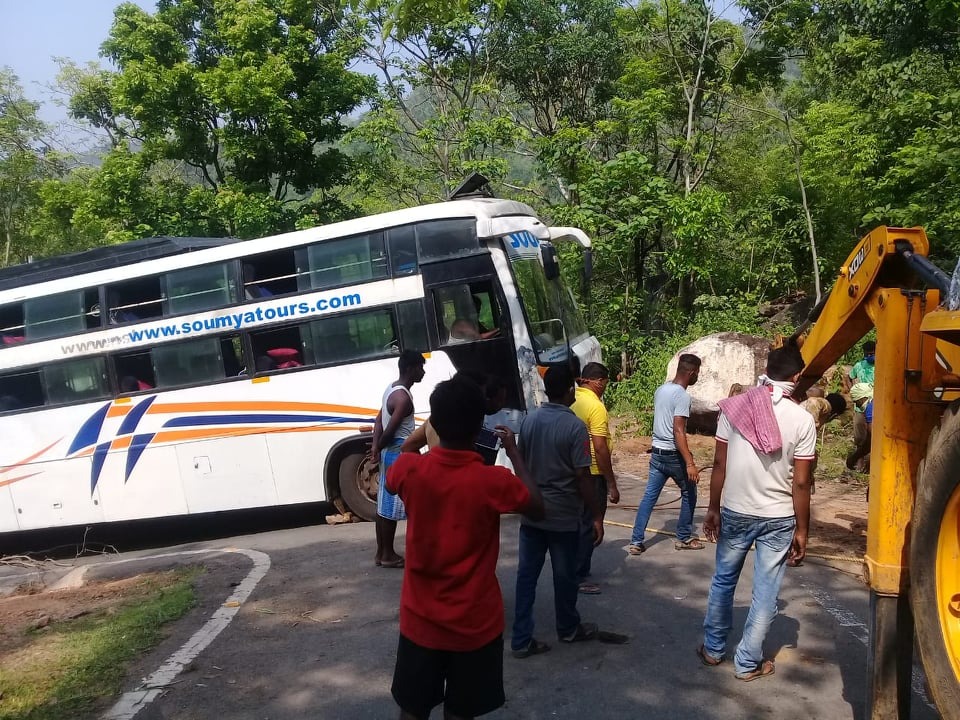 ସୋରଡା,୨୪ା୫,(ଡି.ଏନ.ଏ.)-ତାମିଲନାଡୁର କୋଏମ୍ବାଟୁରରୁ ୩୨ ଜଣ ପ୍ରବାସୀ ଓଡିଆଙ୍କୁ ଧରି ବଲାଙ୍ଗୀର ଅଭିମୁଖେ ଆସୁଥିବା ଏକ ବସ୍ ଶନିବାର ରାତି ୧୦ଟାରେ ଗଞ୍ଜାମ ଜିଲା ସୀମାନ୍ତ ସୋରଡା-ଦାରିଙ୍ଗବାଡ଼ି ୪ ନଂ. ଘାଟିରେ ଫସି ରହିଥିଲା। ଫଳରେ ପ୍ରବାସୀମାନେ ଘାଟିରେ ସାରା ରାତି ସମୟ କାଟିଥିଲେ। ଖବରପାଇ ସୋରଡା ଥାନାଧିକାରୀ ରମେଶ କୁମାର ପ୍ରଧାନ, ଏସଆଇ ସୁନୀଲ କଣ୍ଡୋଗୋରୀ, ସରପଞ୍ଚ ଉପେନ୍ଦ୍ର ବେହେରା, ଜିଆରଏସ କଳିଆ ପଣ୍ଡା ପ୍ରମୁଖ ପହଞ୍ଚି ପ୍ରବାସୀଙ୍କ ପାଇଁ ଶୁଖିଲା ଖାଦ୍ୟ, ପାନୀୟ ଜଳ ବ୍ୟବସ୍ଥା କରିଥିଲେ। ପରେ ବସକୁ ଉଦ୍ଧାର କରିବାକୁ ପ୍ରୟାସ ଚଳାଇ ଥିଲେ ମଧ୍ୟ ବିଫଳ ହୋଇଥିଲେ। ରବିବାର ସକାଳୁ ଜେସିବି ମେଶିନ ସାହାଯ୍ୟରେ ବସକୁ ଉଦ୍ଧାର କରାଯିବା ପରେ ବସଟି ପ୍ରବାସୀଙ୍କୁ ଧରି ବଲାଙ୍ଗୀର ଅଭିମୁଖେ ବହାରି ଥିଲା। ପ୍ରକାଶ ଯେ, ଘାଟି ରାସ୍ତାଟି ଅଣଓସାରିଆ ଥିବାରୁ ବସଟି ବୁଲାଣିରେ ଉପରକୁ ଉଠି ନ ପାରି ଫସି ରହିଥିଲା।